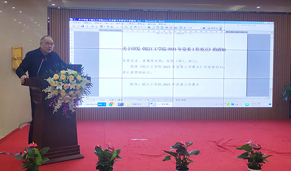 朱洪高发表讲话指出,2021年是建党一百周年,是国家“十四五”规划开局之年。本次会议全面布置了学校党委和行政工作,既是一次工作会,也是一次动员会,揭开了学校2021年各项工作的序幕。朱洪高要求,会议要扎扎实实搞好内涵建设、精益求精做好学校管理、认认真真抓好社会服务。2021年学校要深入贯彻习近平总书记关于教育的重要论述和全国全省教育大会精神,全面贯彻落实立德树人根本任务,以学校“十四五”规划开局为引领,以本科教学工作合格评估和内涵建设为抓手,实现学科专业布局优化,育人管理质量提升,特色发展优势突出。