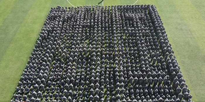 在军训成果汇报阶段,参训学员不断变化方阵,摆出党徽、“100”“2021”等图案庆祝中国共产党成立100周年,通过“祖国”“人民”“中国”等文字方阵,礼赞国庆。