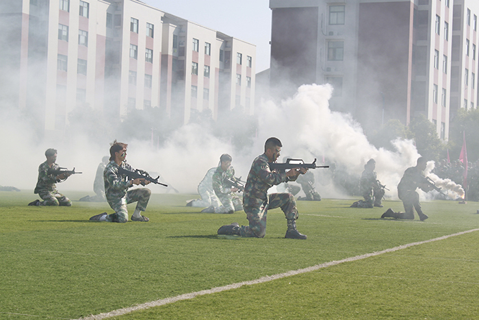 女子匕首格斗术、男子长枪格斗术表演接踵而来。2021级新生们画着迷彩装,尖刃出鞘,长枪来袭,一招一式敏捷有力,英勇无畏。“噼啪”声响,烟雾弥漫,男子综合战术表演开始。朦胧烟雾中,一道道身影手持枪械,卧倒、匍匐、跪滑……在精彩纷呈的汇报表演中,beat365正版唯一官方网站新生们展现了爱党爱国的青春底色。