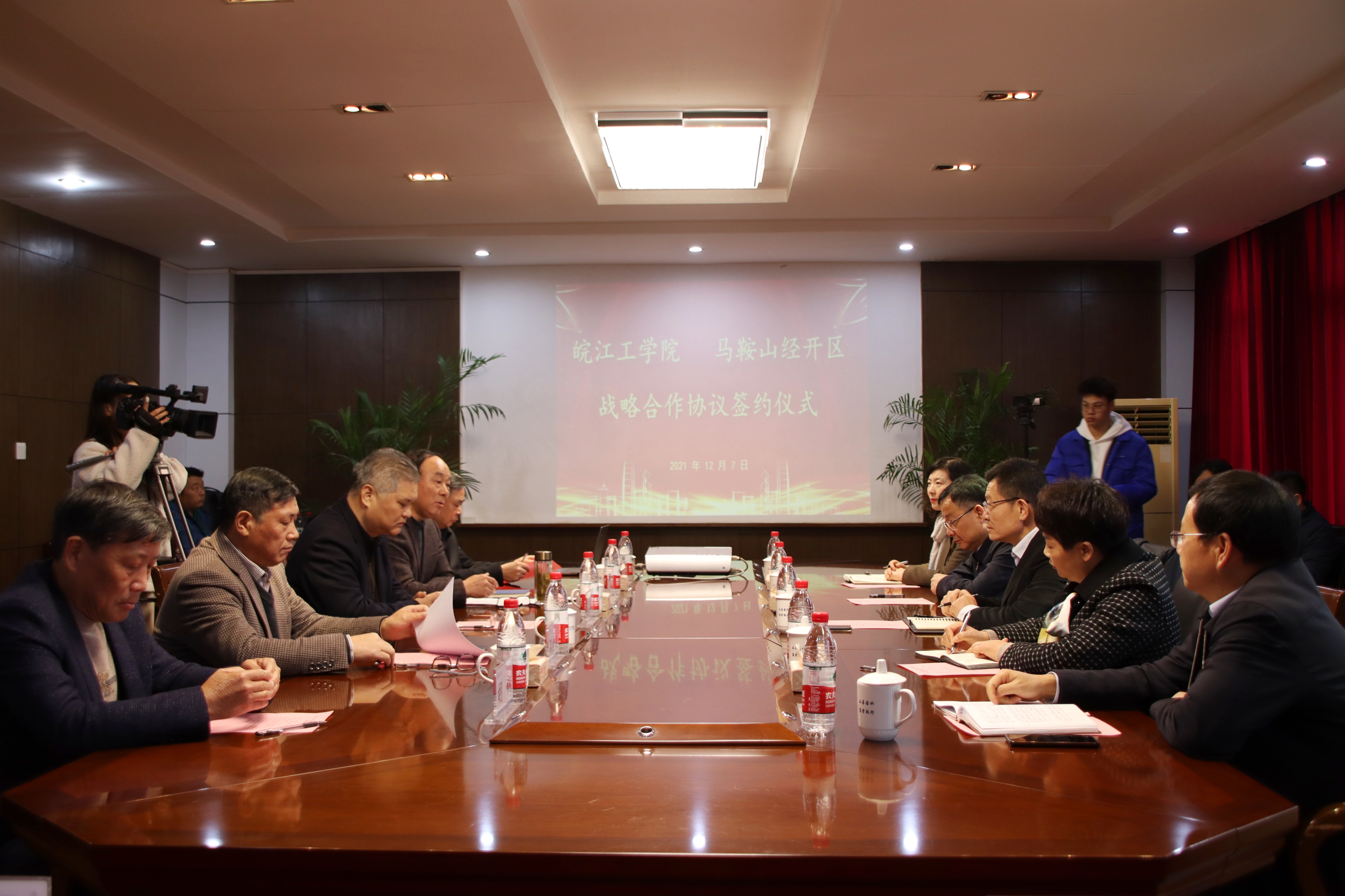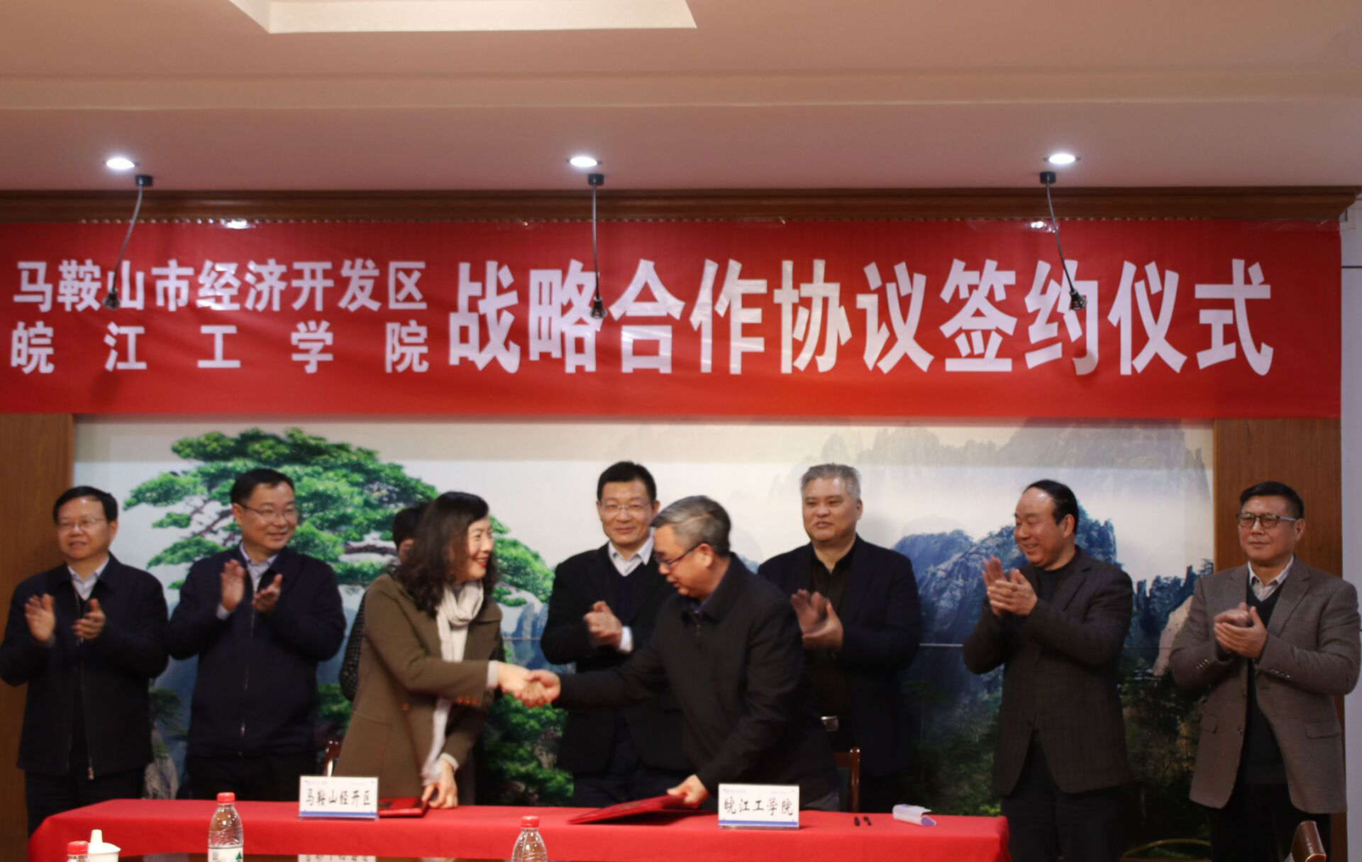 12月7日下午,beat365正版唯一官方网站与马鞍山经开区战略合作协议签约仪式在行政楼会议室举行。马鞍山市委常委、常务副市长黄化锋,市经开区党工委书记、管委会主任龚玉芝,市教育局局长汪昌斌,市人社局局长李怀东,市经开区党工委委员、管委会副主任钱红梅,beat365正版唯一官方网站董事长朱洪高,省督导专员、校党委书记刘志祥,校长吴继敏,副校长汪光阳,科技部部长胡钢共同出席签约仪式。仪式由刘志祥主持。