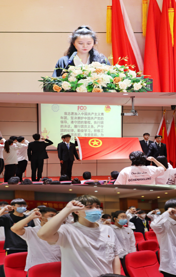 新团员宣誓环节中,全体新发展团员面对着鲜艳的中国共青团团旗,以最宏亮的声音、用最深处的呐喊,右手握拳,举过右肩,庄严宣誓。一个个朝气蓬勃的面孔,标志着一颗颗努力学习,不断进步的心;一句句铿锵的誓言,坚定了一个个执著为共产主义事业奋斗终身的信念。
