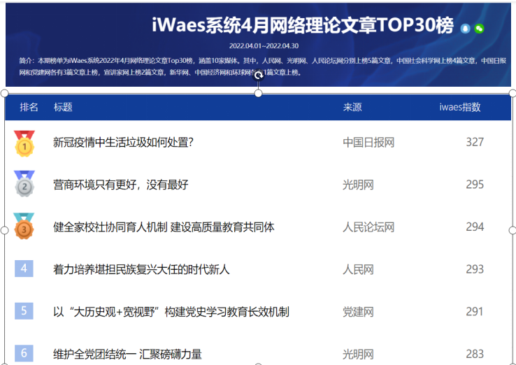 “思想理论网络文章评价系统”(Ideological web articles evaluation system)由光明日报、光明网和南京大学共同主持设计并定期发布,以在党报、党刊以及各类主流门户网站上发布的有关马克思主义、思想政治教育等一系列理论文章为评价对象,坚持定量分析与定性评价相结合的原则方式,通过数据抓取与同行评议的方式,分别计算文章的“来源分”“传播分”和“专家分”,得出综合、客观、科学、权威得分。推动网络文化成果评价认证体系建设,推动将优秀网络文化成果纳入高校科研成果统计、列为教师职务职称评聘条件、作为师生评奖评优依据。