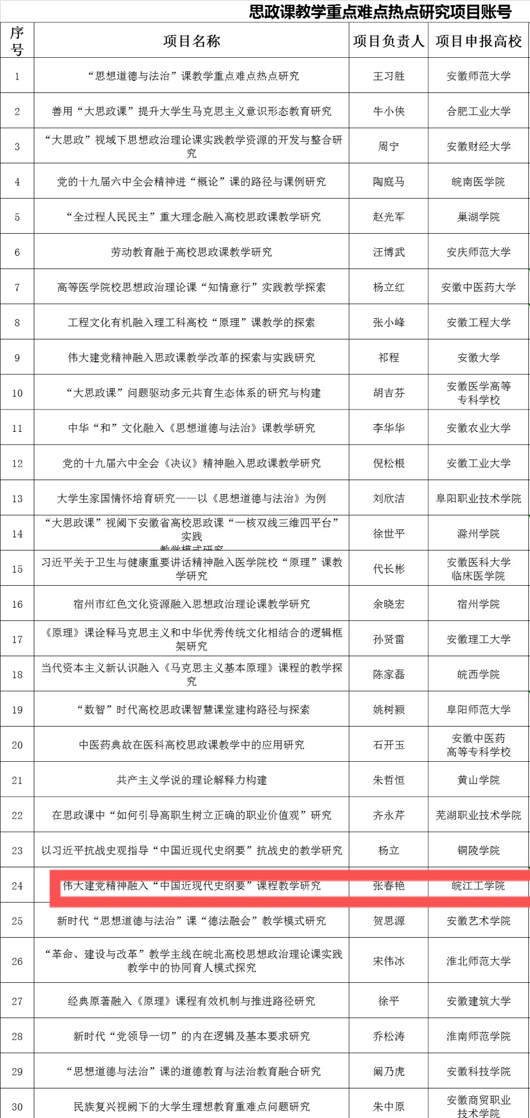 2022年6月,中安徽省委教育工作委员会、安徽省教育厅下发了《关于公布2022年安徽省“三全育人”试点省建设暨高校思想政治工作能力提升项目立项名单的通知》文件,经高校申报、专家组会评、评委会评审和公示,beat365马克思主义学院教研室主任张春艳副教授获批全省“三全育人”项目,项目名称为《伟大建党精神融入“中国近现代史纲要”课程教学研究》。