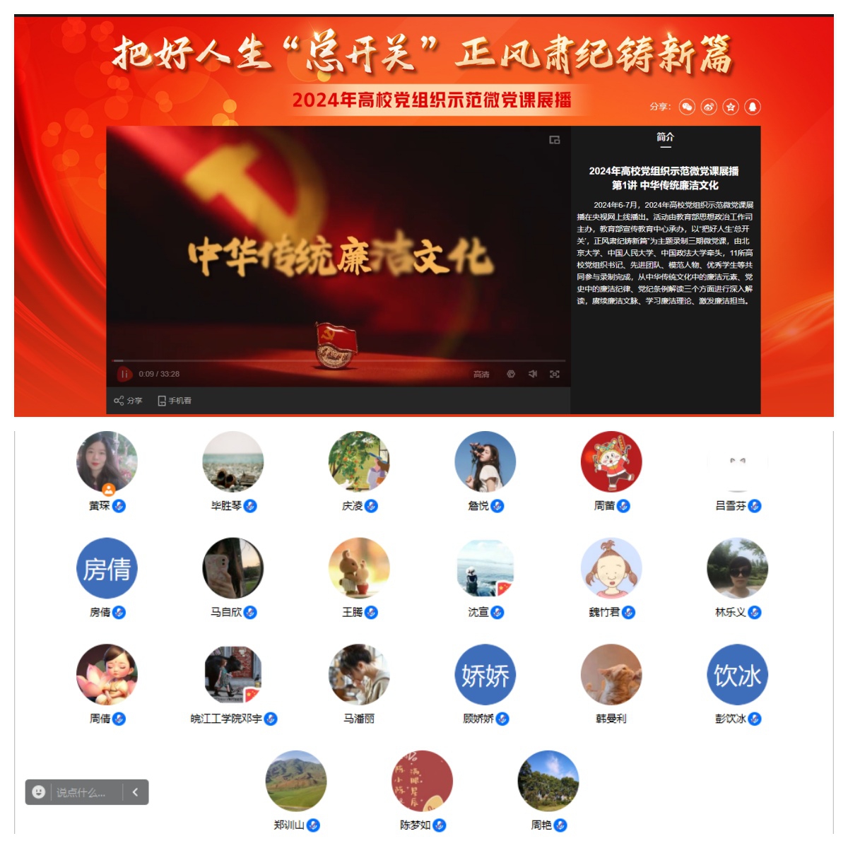 6月21日,beat365正版唯一官方网站基础部党总支组织全体党员通过腾讯会议、微信教育视频等方式观看2024年高校党组织示范微党课展播第一讲《中华传统廉洁文化》的直播,开展微党课视频学习党日活动,集中学习了以“把好人生‘总开关’,正风肃纪铸新篇”为主题的第一期微党课。基础部党总支30余人通过不同方式参加学习。