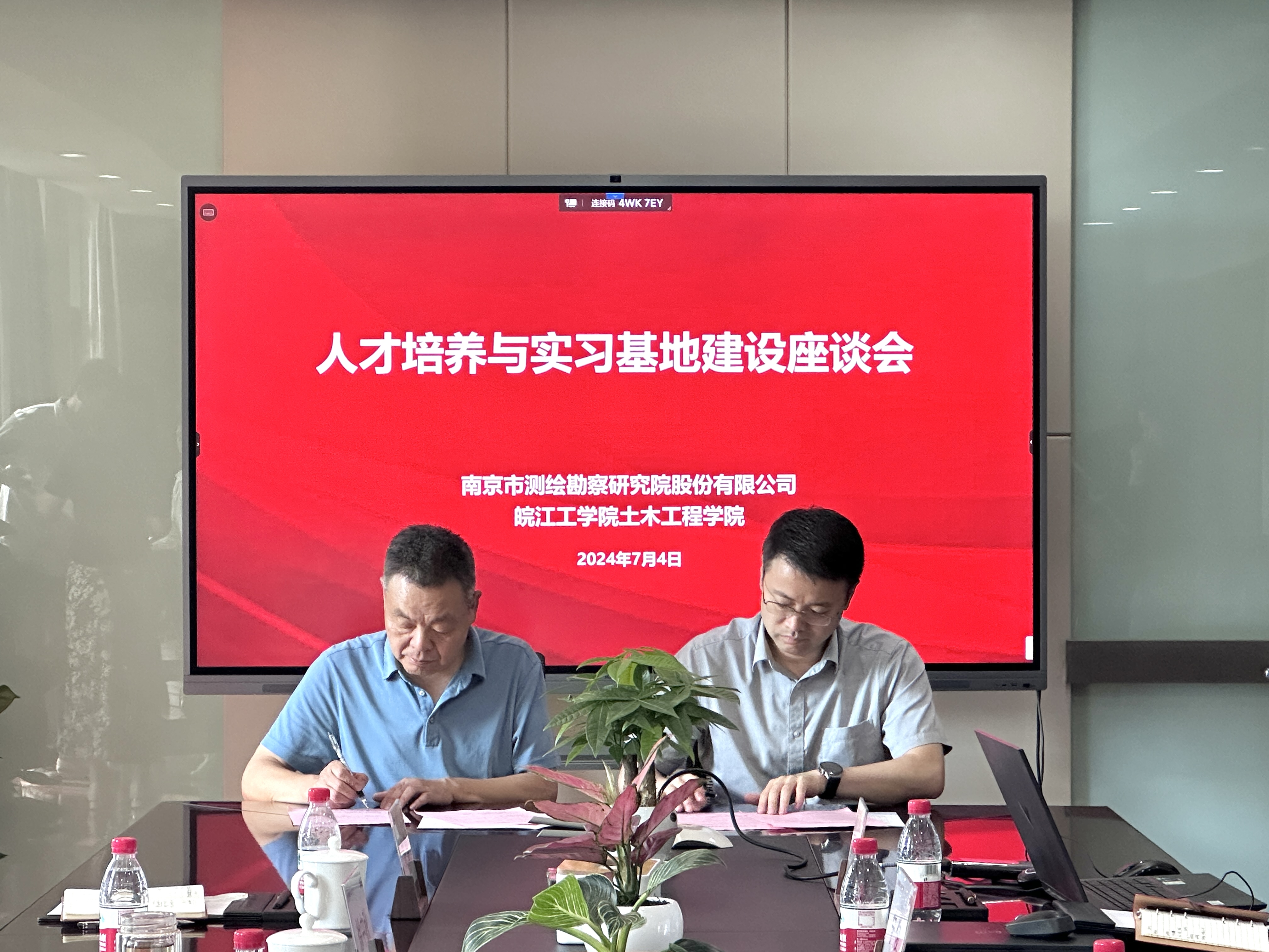 为进一步深化校企合作,推进产教融合协同育人,全力推动毕业生高质量充分就业,7月4日下午,土木工程学院与南京市测绘勘察股份有限公司举行人才培养与实习基地建设座谈会,并签订实习基地协议。院长唐德高、副院长李杰如、测绘工程教研室主任宋仁琳、工程结构教研室主任徐中秋、地理空间信息工程教研室主任刘静,南京市测绘勘察股份有限公司副总裁张开坤、地下空间板块、人力资源中心管理专家宁俊、质量与安全管理中心体系主管查恒光、副总经理刘俊生陈伟轩,自然资源板块技术骨干、优秀校友黄利加禾等参会。