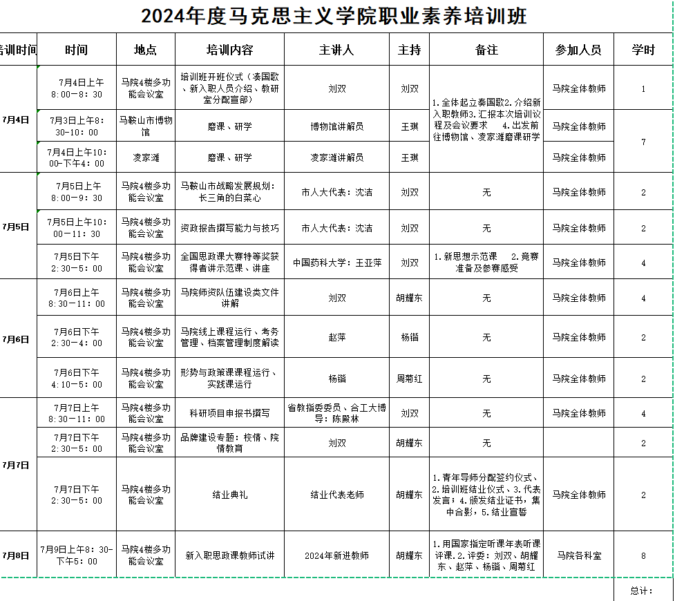 7月4日下午,马克思主义学院举办2024年思政课教师职业素养培训班开班仪式并组织研学、磨课。马克思主义学院总支书记、常务副院长刘双,副院长胡耀东,各教研室主任及全体思政课教师参加。会议由刘双主持。