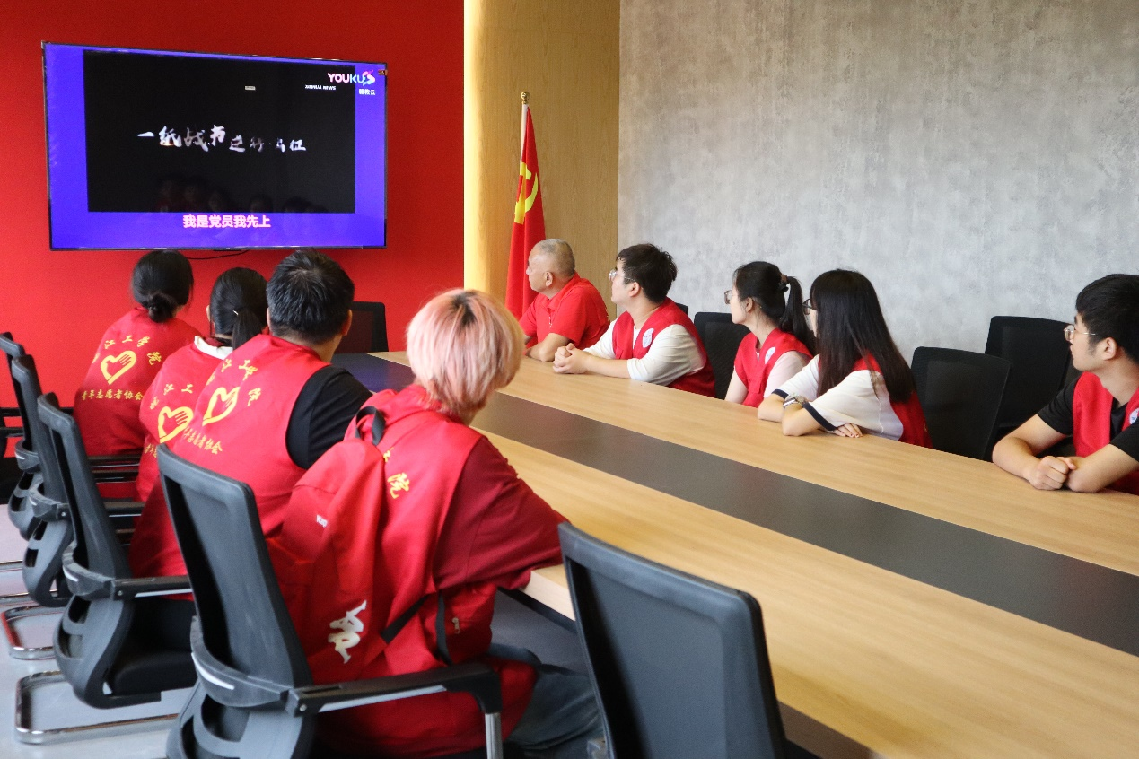 图为团队成员们在会议室观看革命影片。李欣颖 供图