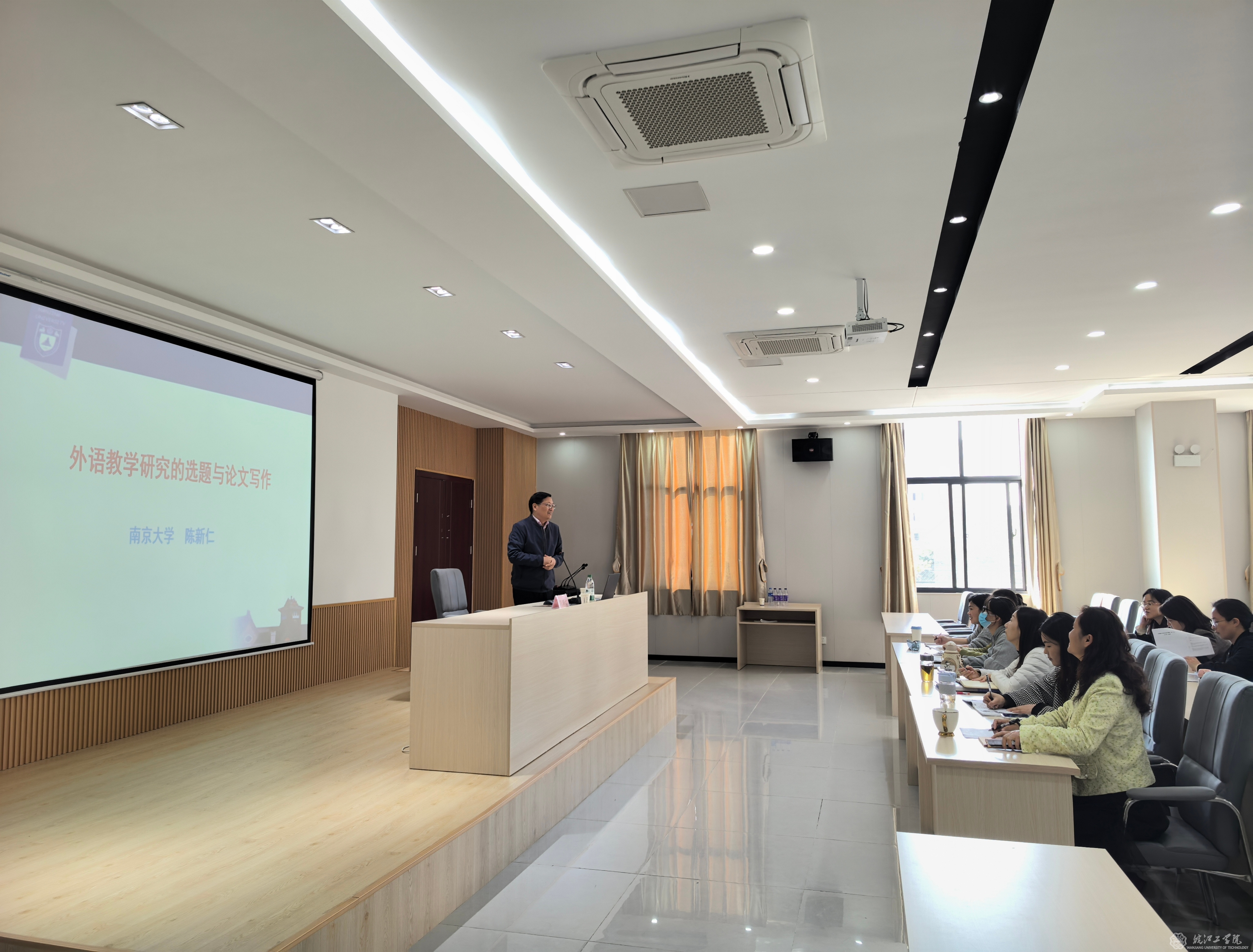 为推动学院科研水平发展,强化理论知识的学习与应用,10月30日下午,通识教育学院特邀南京大学陈新仁教授,在弘毅楼209会议室开展了主题为《外语教学研究的选题与论文写作》的专题讲座。讲座由院长助理毕胜琴主持,英语教研室全体教师到场参加学习。