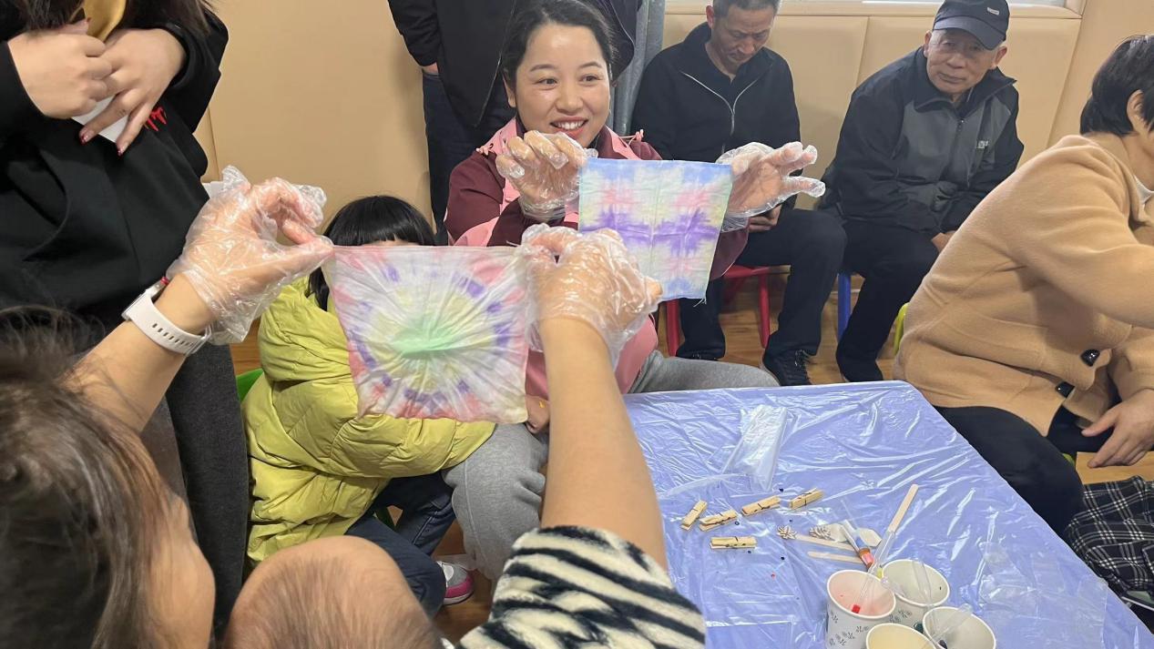 志愿者们早早来到中心布置活动现场,精心准备了教案、手工材料、小礼品等。过程中志愿者们耐心的指导儿童和家长使用各种颜料、工具扎染丝巾,家长和孩子们都全身心投入其中。志愿者们温暖的笑容、贴心的话语,都在传递着他们对残疾儿童的深深关怀。活动最后,孩子们在志愿者和家长的帮助下都制作出了美丽的扎染作品。