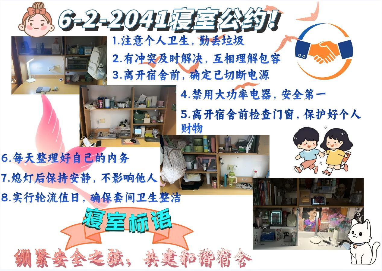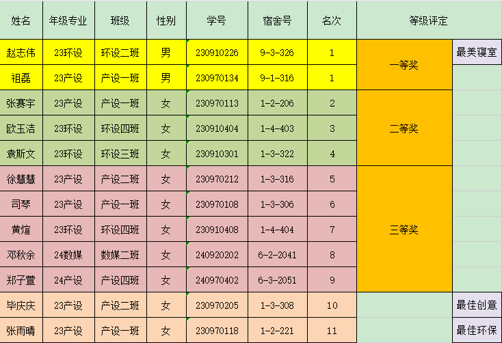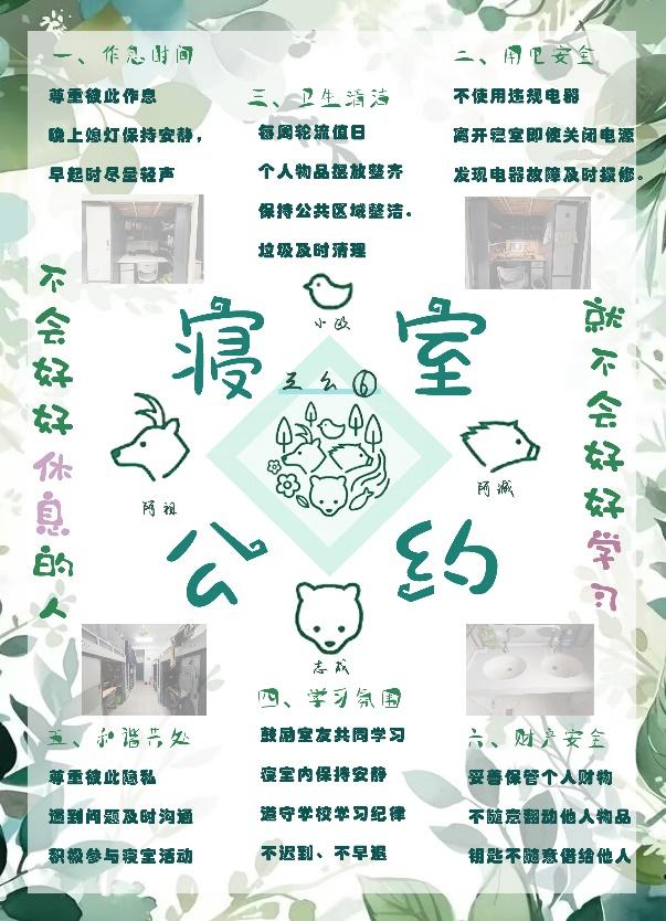 评审现场,老师们从标语的内涵力、公约的合理性,形象的展示度,展板设计的艺术性对作品进行综合评定。评选过程严谨公正,确保每一份获奖作品都是对寝室美化建设主题的深度挖掘和完美诠释。经过评选和投票,最终获奖名单如下: