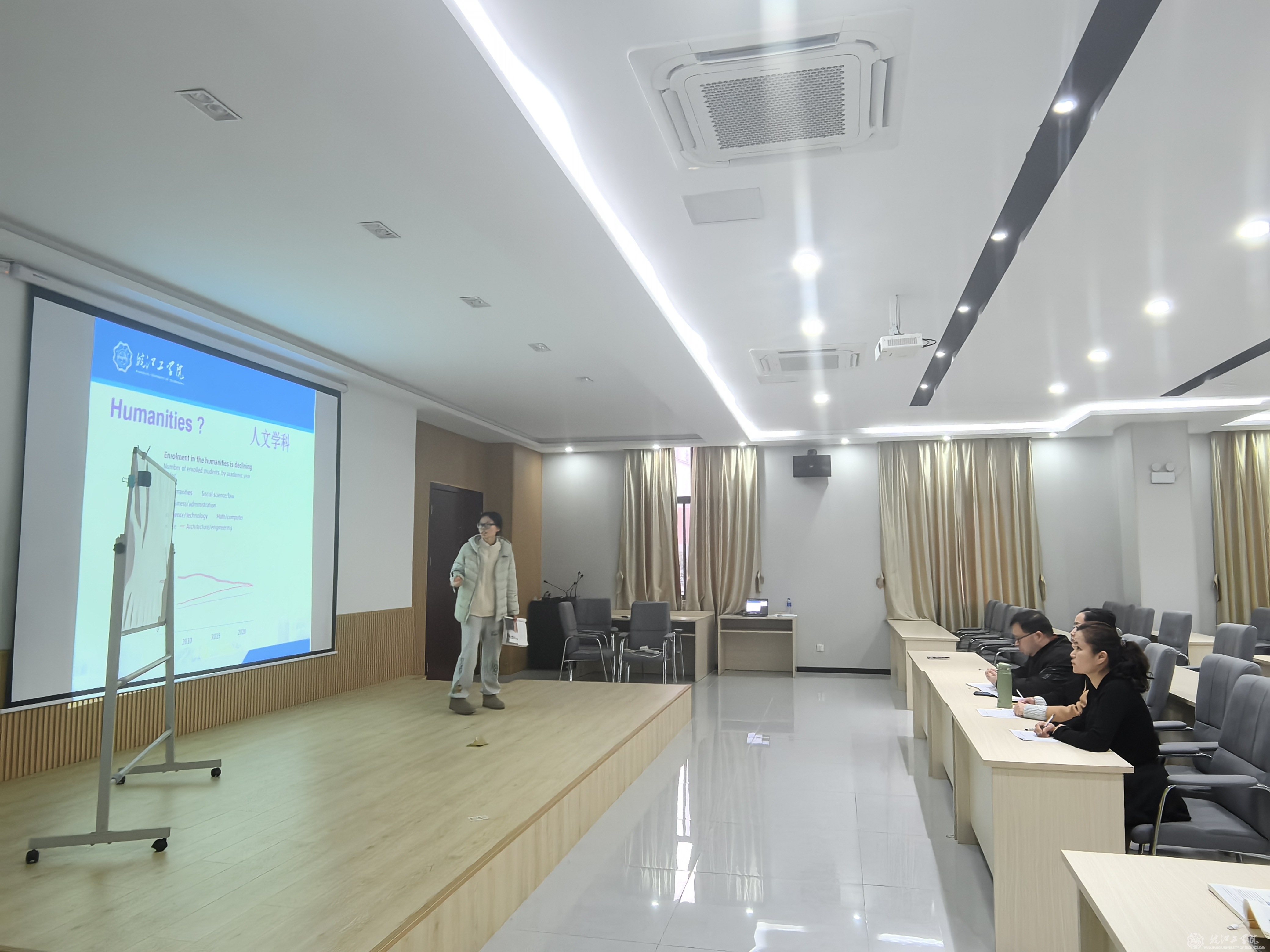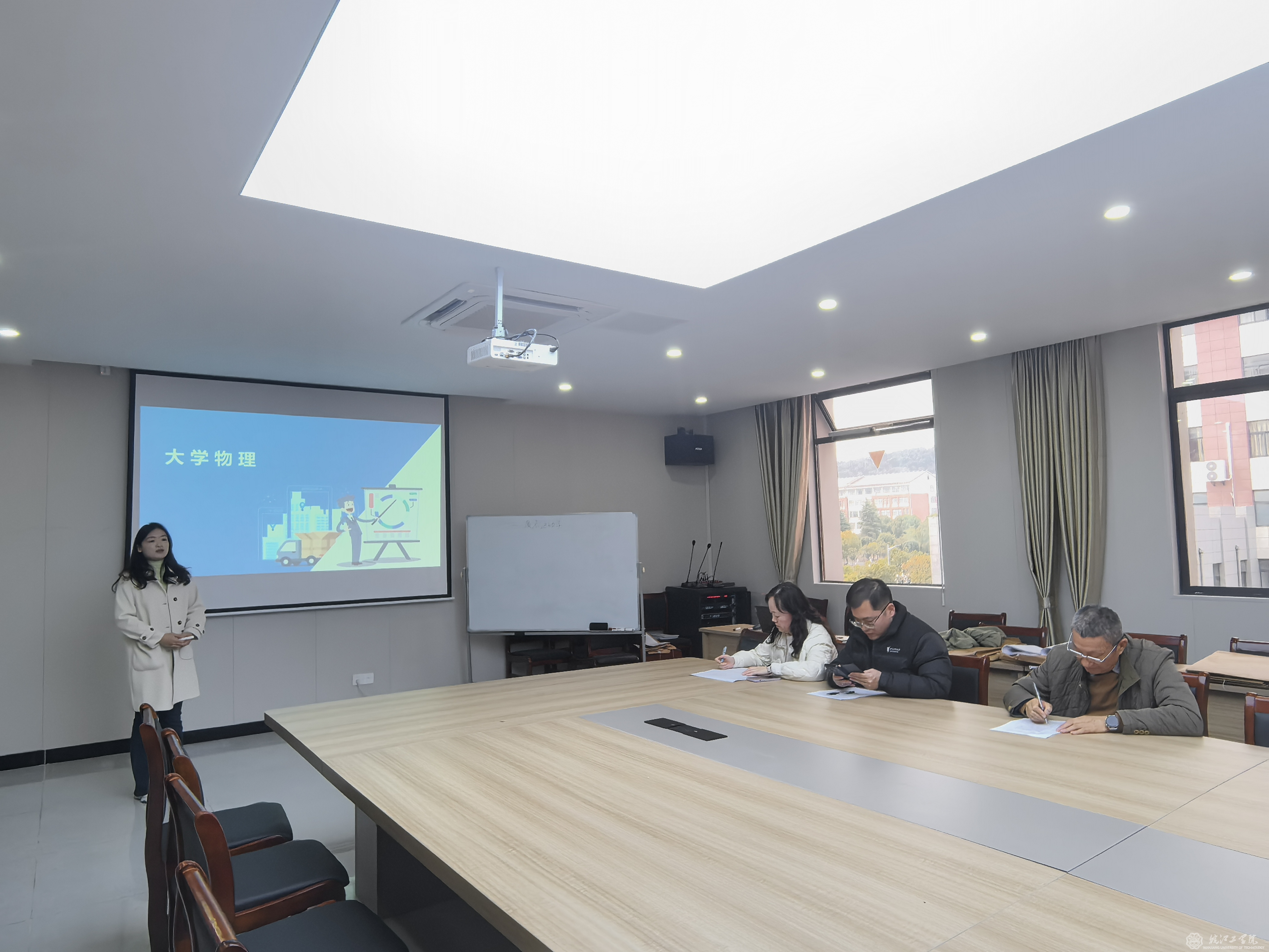 209会议室:数学教研室教师以逻辑推演为核心,通过案例建模展现学科应用价值;英语教研室创新语言教学模式,融入跨文化交际与价值观引导。