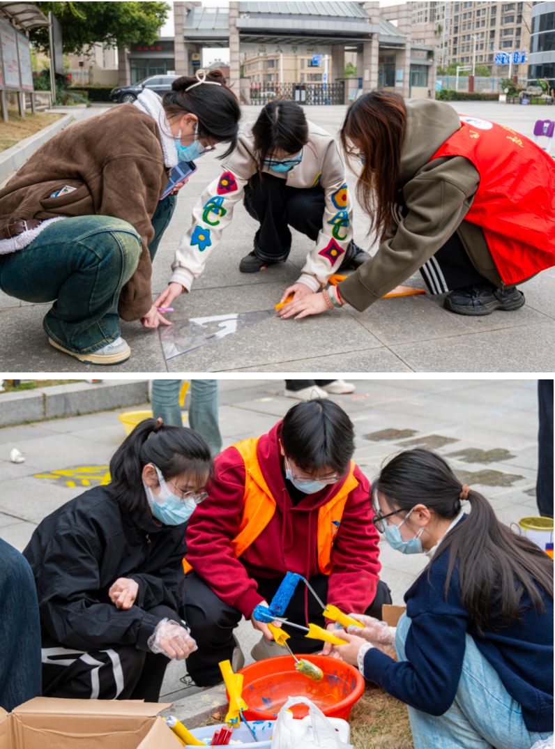 为保障活动效果,艺术设计学院提前一个月与特教学校对接,精心规划活动方案。经过实地考察,最终选定校内两条道路作为创作区域。志愿者们分为测量组、设计组和绘画组展开工作。测量组的同学们手持专业工具,仔细丈量每一处地面尺寸;设计组根据测量数据,现场绘制出精确的图案轮廓;绘画组的同学们则俯身地面,用油漆在地面上描绘出色彩斑斓的几何图形、动物形象及互动游戏区。这些鲜明的视觉元素和互动设计,旨在帮助孩子们提升认知与运动能力。特教学校万老师表示:“艺术化的环境改造有效改善了孩子们的空间认知能力,这种‘艺术疗愈’的创新形式值得推广。”