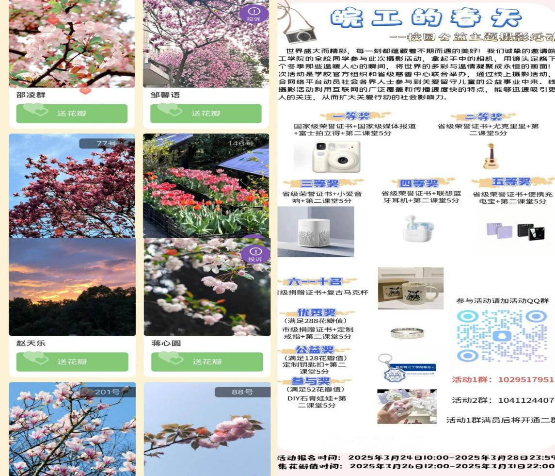 本次活动分为四个阶段:一、前期宣传阶段(3月21日至3月23日),通过全面铺开的宣传活动,吸引了全校师生的广泛关注;二、报名及作品提交阶段(3月24日上午10时至3月28日夜间),报名通道正式开启,同学们纷纷上传自己的摄影作品完成报名;三、作品投花瓣互动阶段(3月26日至3月31日),同学们积极转发个人作品至社交媒体,通过获取花瓣的方式为自己的作品拉票,同时吸引更多社会爱心人士关注到特殊儿童群体;四、评分与奖励阶段,将根据作品获得的花瓣值进行排名,为获奖者颁发丰厚奖品、荣誉证书及第二课堂学分。