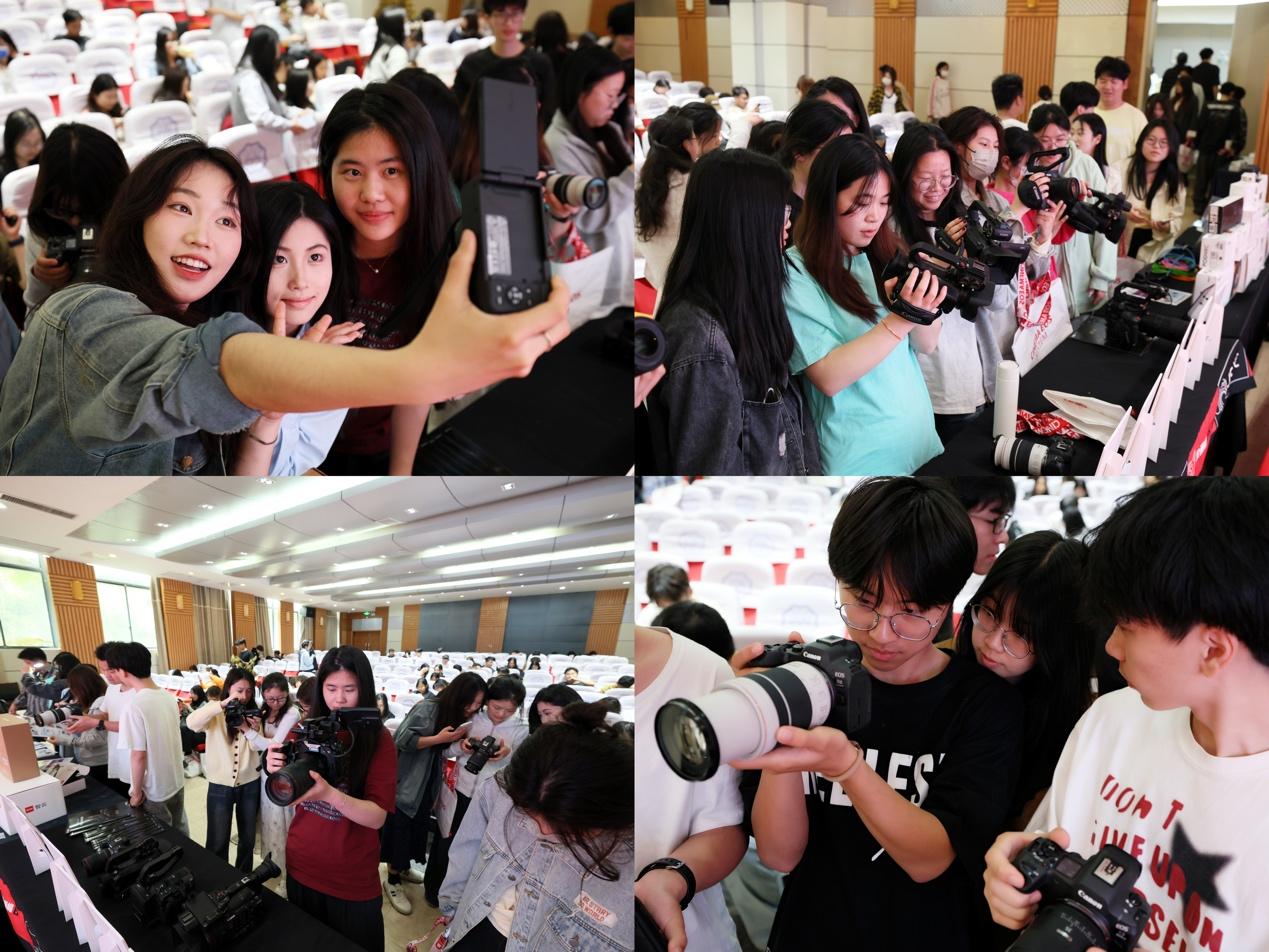 “构图是画面的骨架,光影是影像的灵魂。”邵老师通过对比不同场景的拍摄效果,生动展示了如何利用自然光与人造光塑造画面层次感,并分享了快速调整曝光参数的实用技巧。同时,他还邀请了两位现场的同学们亲身参与了设备的调试与拍摄,实践操作也都令同学们受益匪浅。本次讲座特别设置设备体验环节,现场陈列佳能C70电影机、爱图仕灯光套装、大疆航拍无人机等十余套行业级设备,供学生亲手操作。在讲师与助教的指导下,同学们分组进行实战演练,从调整光圈快门到布光构图,从静态拍摄到动态跟焦,沉浸式感受专业影视创作的流程与细节。
