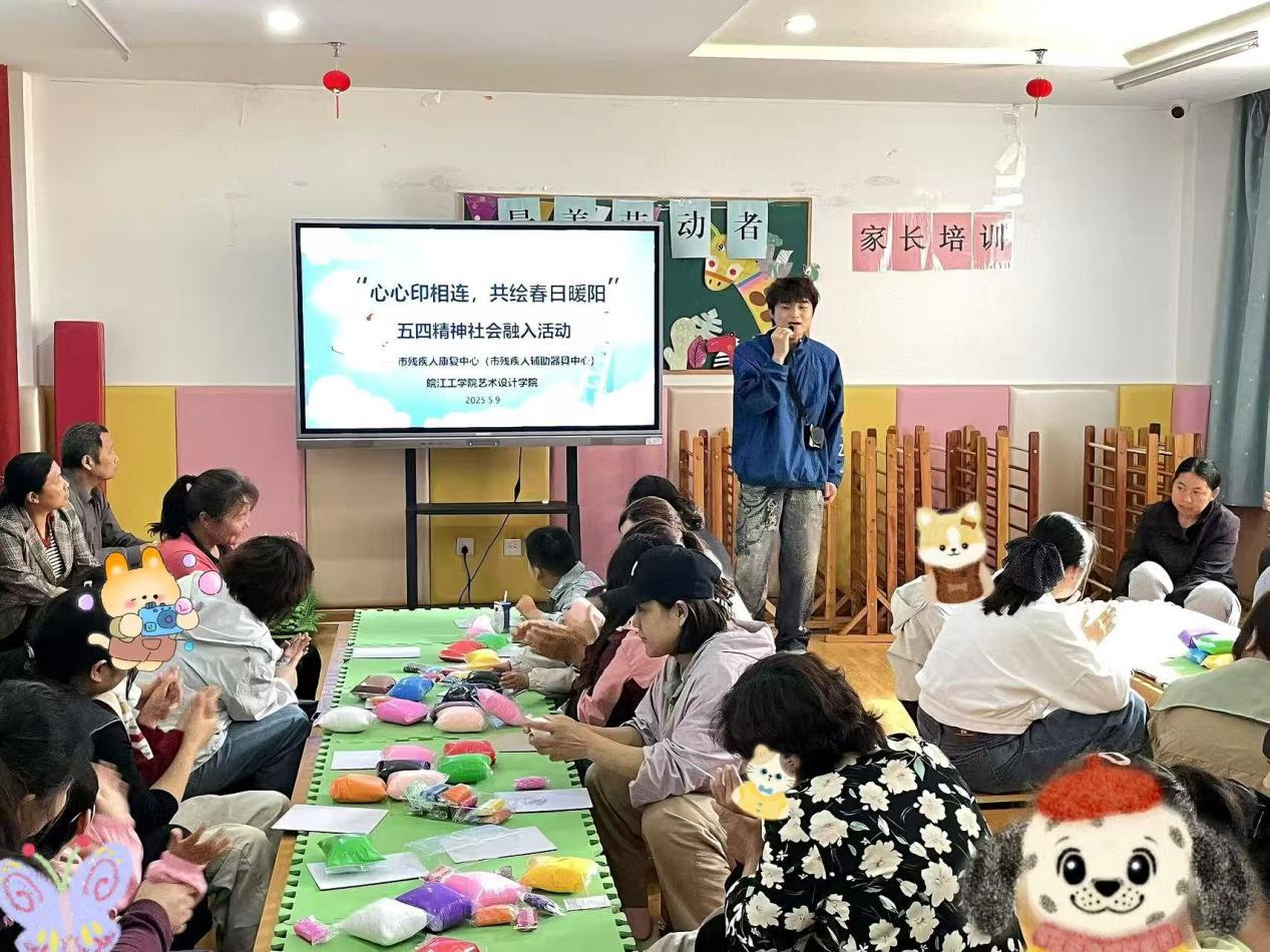 为弘扬五四精神、践行青年担当,5月9日上午,艺术设计学院学生党支部与分团委组织20余名学生志愿者赴马鞍山市残疾人康复中心(市残疾人辅助器具中心)(以下简称市康复中心)开展了“心心印相连,共绘春日暖阳”专业实践志愿服务活动。志愿者们发挥艺术专长,通过暖场音乐活动和创作超轻黏土立体画,为市康复中心的儿童们送去关怀与欢乐,用创意传递温暖力量。