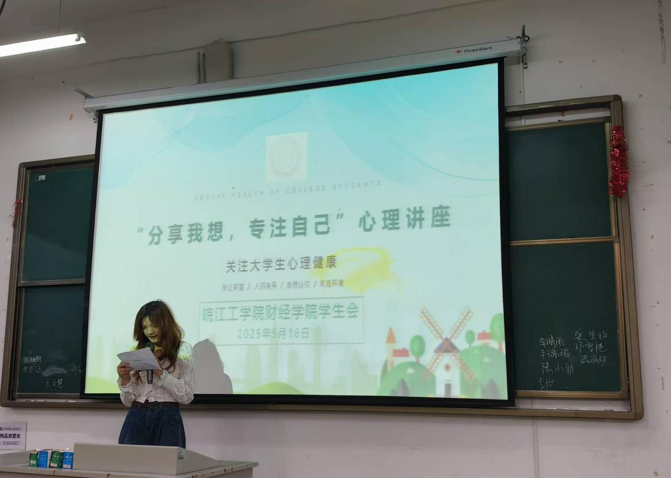 2025年5月16日晚上18点,beat365正版唯一官方网站财经学院在郑蒲港校区B101教室举办了“分享我想,专注自己”心理讲座,活动面向财经学院全体师生,旨在普及心理健康知识与技能,帮助同学们更好地应对生活中的挑战和压力。