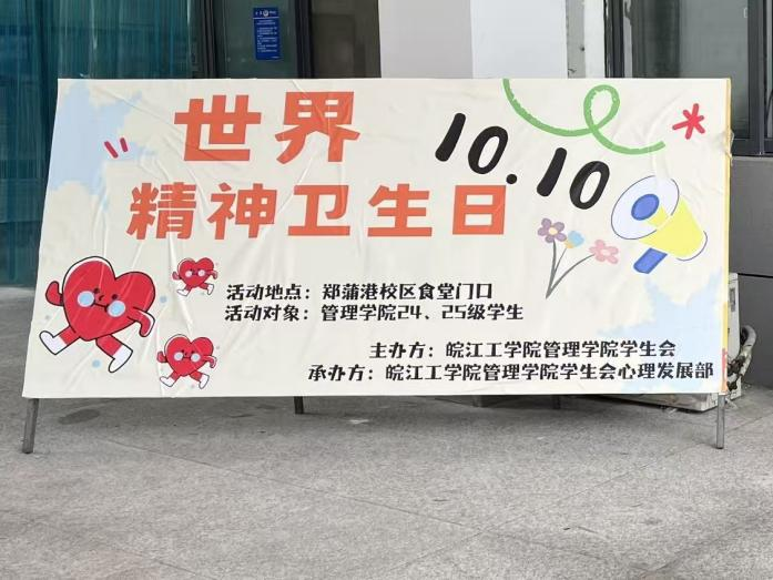 为进一步提升我院学生心理健康素养,营造关注心理健康、重视心灵成长的校园氛围,筑牢学生心理防护屏障,引导广大青年学子以积极乐观的态度融入大学生活,值此“10月10日世界精神卫生日”之际,管理学院学生会心理发展部于10月10日至10月13日,组织开展“关爱心灵,赋能成长”主题系列活动。活动通过丰富多元的形式,为管理学院学生搭建心灵对话与情感共鸣的平台,让温暖与理解在校园中持续传递。