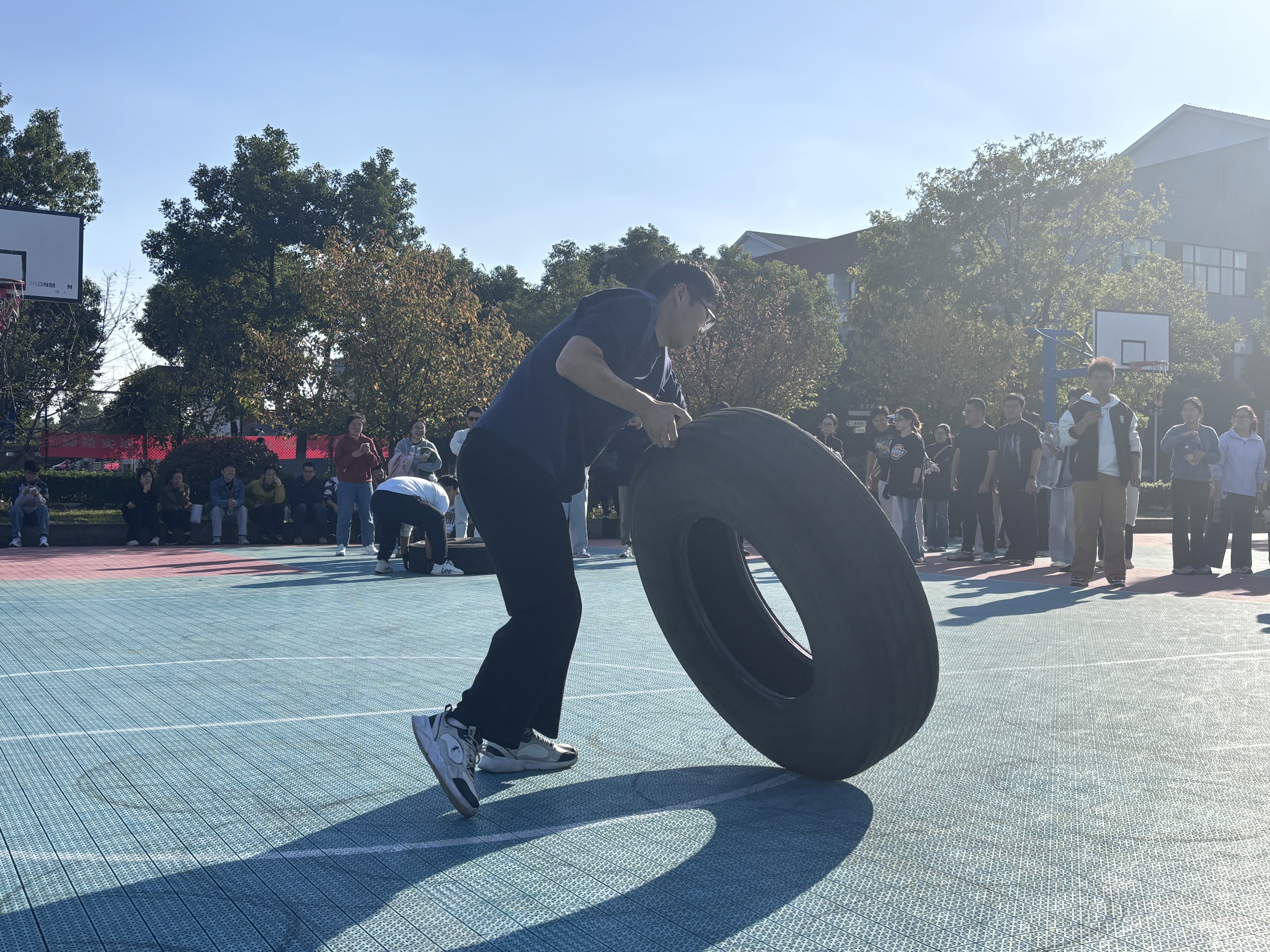 比赛中段,由于体能急剧消耗,队伍的行进速度面临严峻挑战。然而,没有一位老师松懈或放弃。他们相互鼓励,高呼着“通识,加油!”,每一次交接都伴随着充满信任的击掌。尤其在最后冲刺阶段,所有队员都拼尽全力,直至将轮胎推过终点。