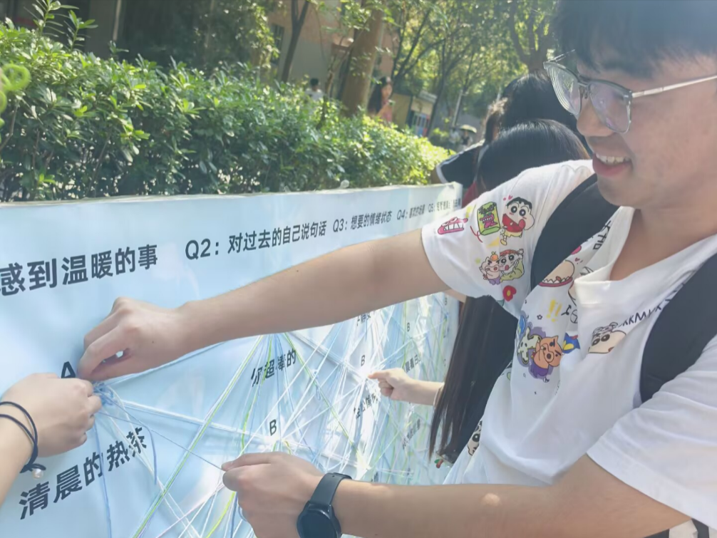 从食堂门口到校园广场,活动现场始终涌动着温情与共鸣:有人在“宠物的陪伴”前分享与爱宠的趣事,有人在“多爱自己一点呀”的选项前感动驻足。正如一位组织者所言:“当一根毛线穿过掌心,焦虑便有了形状;当万千毛线交织成网,青春便有了托举。”最终完成的展板宛如一张巨大的“心灵治愈之网”,将青春的迷茫、温暖的瞬间与未来的期盼紧密编织在一起。 同学们凝望着这幅由集体情感织就的作品,仿佛发起一场无声的宣言:关注心理健康,从来不是一句空洞的口号,而是我们共同编织的日常。