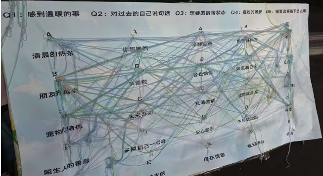 活动现场,一块印有“清晨的热茶”、“朋友的趣事”、“你超棒的”、“辛苦啦”等温暖词汇的展板吸引了众多同学驻足。大家从工作人员手中领取各色毛线,认真选择最能代表此刻心境的词语,将毛线轻轻缠绕在对应选项周围——浅蓝色织出“陌生人的善意”,明黄色勾勒“未来可期”,五彩的毛线渐渐交织成一幅幅独特的“心灵地图”。在指尖缠绕的过程中,不少同学坦言“焦虑好像随着毛线的缠绕慢慢落地了”。