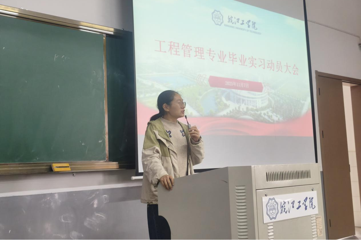 随后,副主任梁英平详细解读了本次毕业实习的具体安排。她从实习时间节点、岗位分配原则、实习任务要求、考核评价标准等方面进行了全面说明,明确了实习日志、周报、调研报告、实习总结等成果的提交规范,并针对工程管理专业常见的施工现场管理、招投标实务、工程造价核算等实习方向,给出了针对性的学习建议。此外,她还特别强调了实习期间的安全注意事项,要求同学们严格遵守实习单位的规章制度,增强安全防范意识,确保实习过程安全有序。