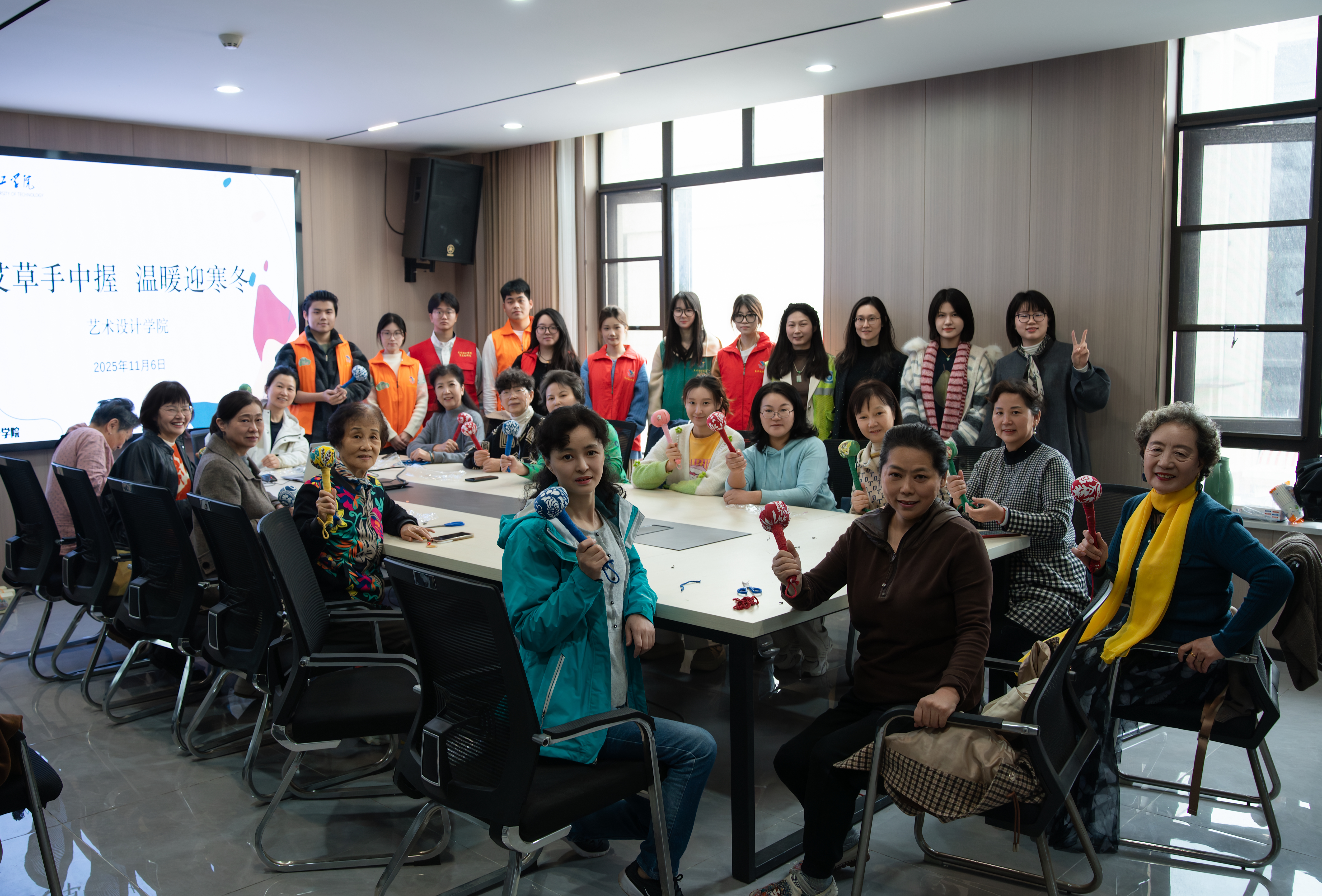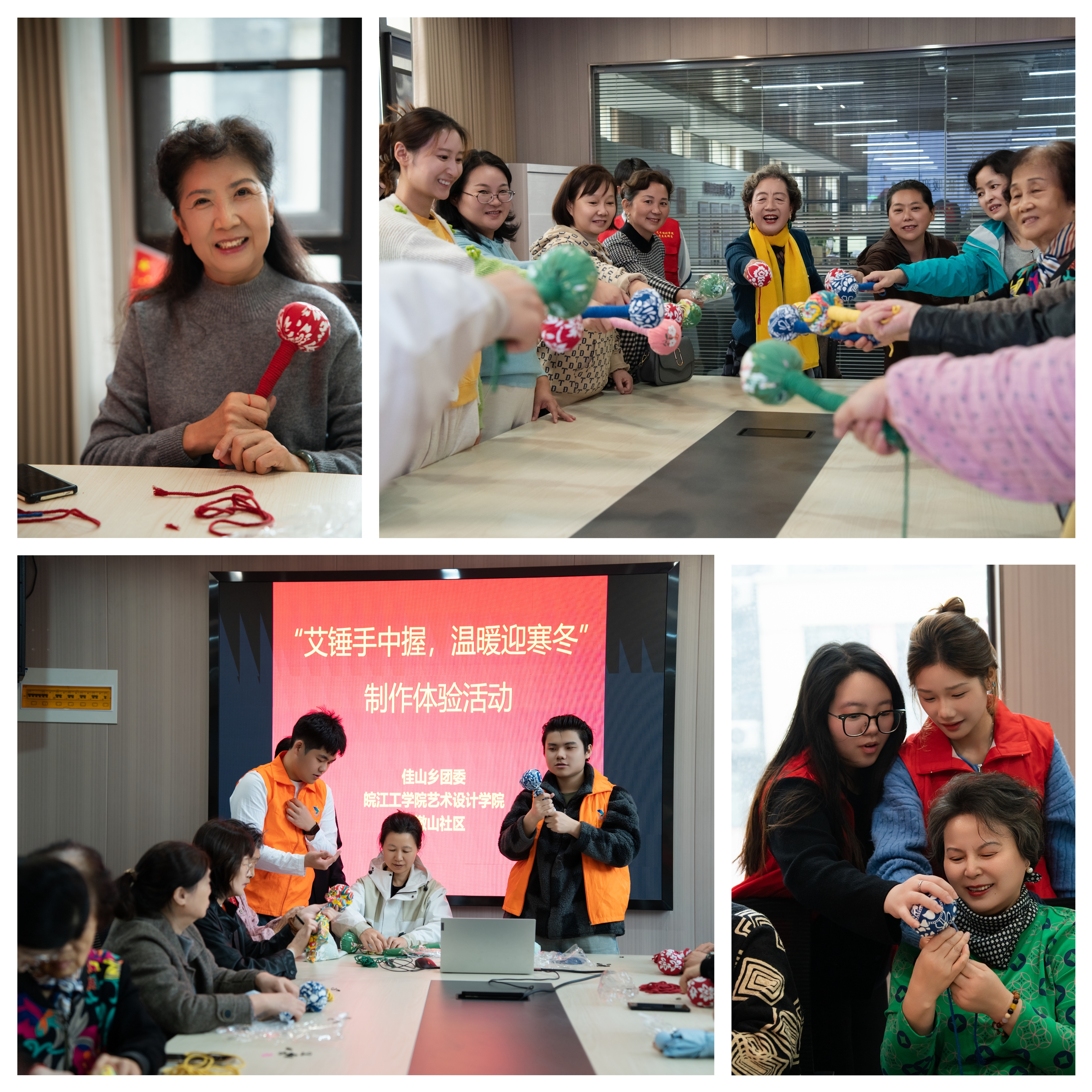 凛冬将至,暖意先行。近日,beat365正版唯一官方网站艺术设计学院学生党支部党员发展对象与分团委学生干部走进马鞍山市烟墩山社区,携手雨山区党外知识分子联谊会的退休老人们,开展了“艾捶手中握,温暖迎寒冬”手工制作体验活动。这场以传统手艺为媒、以温情互动为桥的实践活动,既是青年学子服务长者的暖心之举,更是学院党建与校社共建深度融合的生动实践,彰显了党建引领下育人成效与社会服务的双向奔赴。