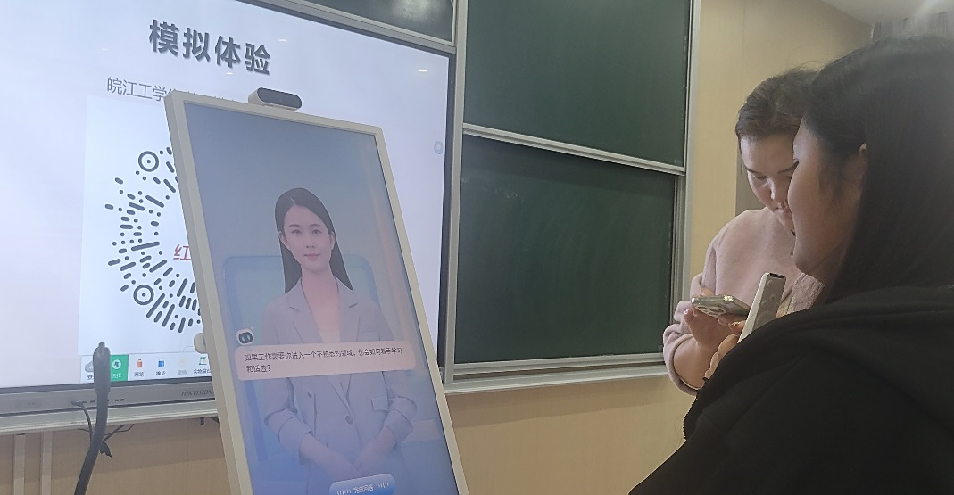 在讲座的互动与交流环节,红海公司同行的工作人员引导在场同学上台实际体验“AI交互机”的强大功能,现场气氛活跃,激发了学生强烈的好奇心与探究欲。由集团自主研发的“AI交互机”是红海公司目前最新的创新成果之一,其核心特色包括了AI语音简历撰写与诊断、模拟面试指导、语音交互精准匹配岗位等功能,属于一站式智能求职终端设备。