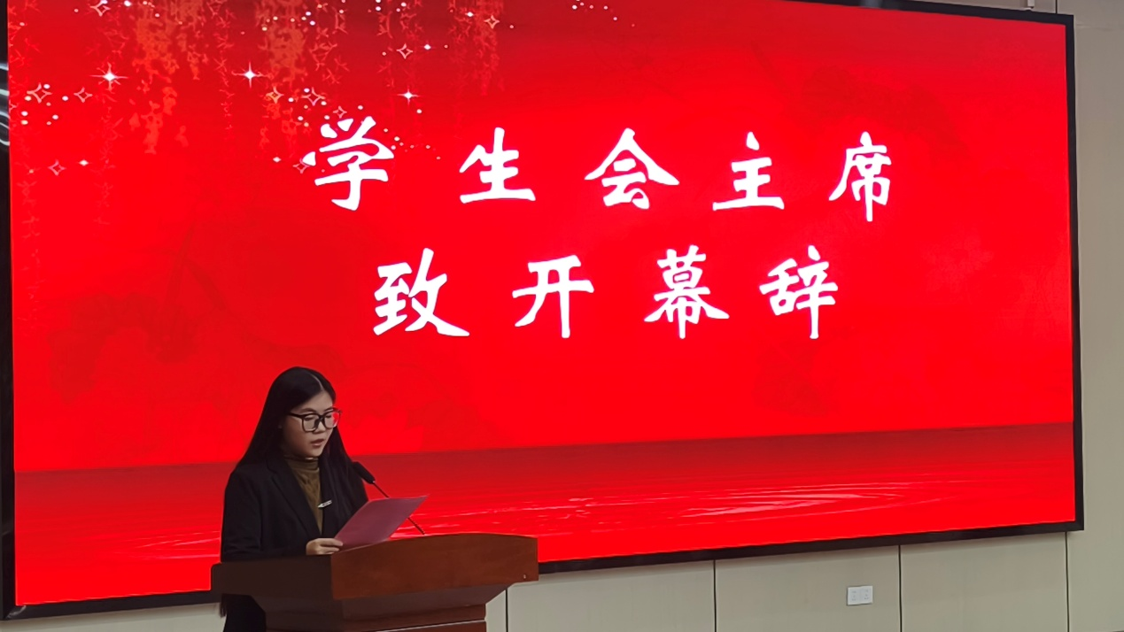 在庄严的中华人民共和国国歌声中,全体与会人员肃立齐唱,展现出青年学子深厚的爱国情怀与昂扬的精神风貌,大会序幕正式拉开。第一届学生会主席团成员卞婉情致开幕辞。她在发言中充分肯定了第一届学生会及团委学生干部过去一年的辛勤付出与工作成效,并对新一届学生组织提出殷切期望,号召全体成员不忘初心、凝心聚力,共同为学院发展注入青春动能,贡献智慧与力量,并预祝大会取得圆满成功。