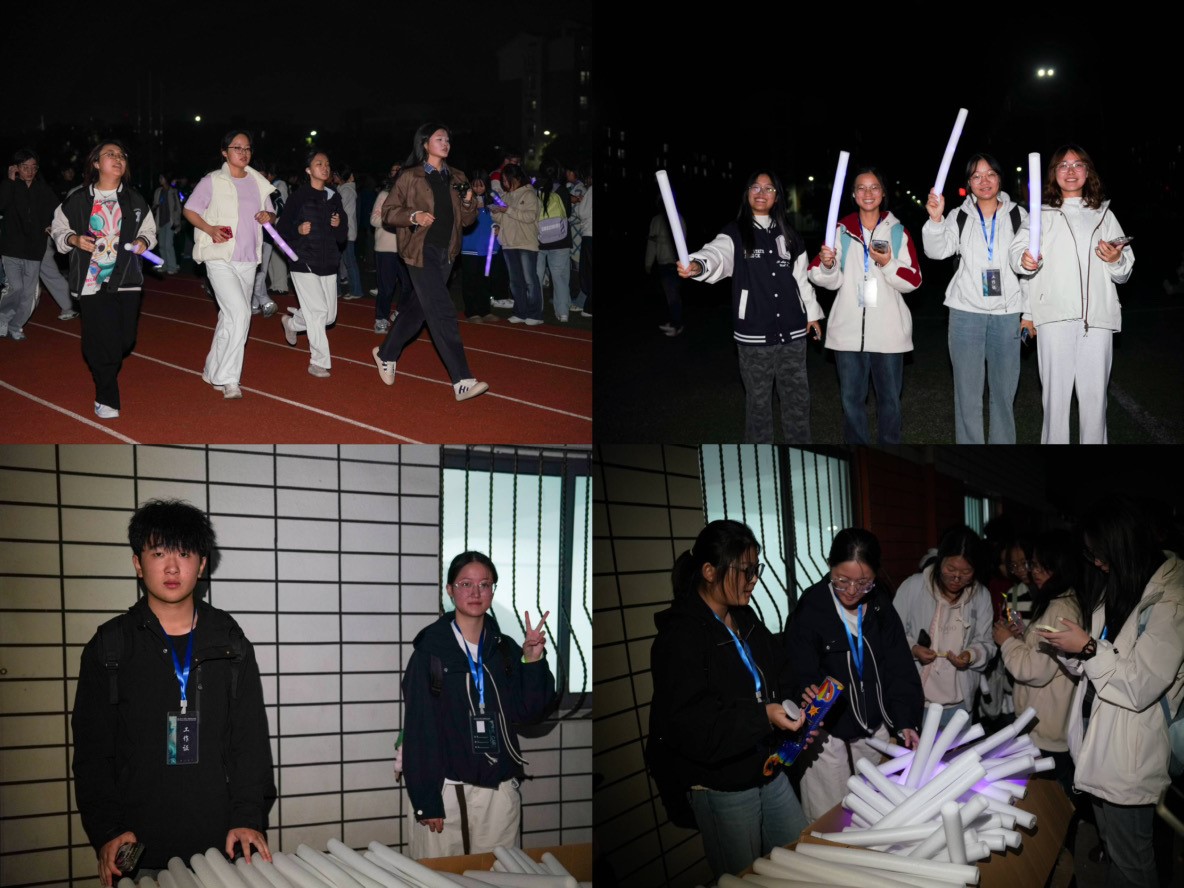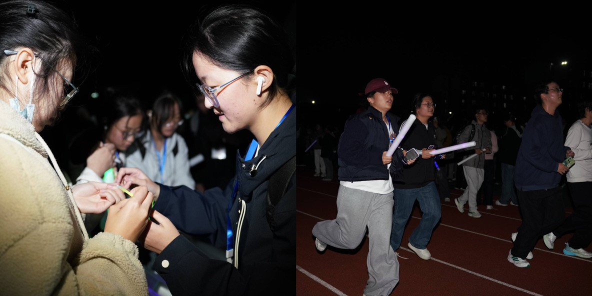 夜幕下,郑蒲港校区的操场化身为一片璀璨的星河。同学们手戴荧光手环,挥舞着五彩荧光棒,在闪烁的光影里尽情奔跑。点点荧光汇聚成流动的光河,欢声笑语驱散了夜晚的寒意,现场洋溢着青春的热力与激情。这场活动不仅是一场体能锻炼,更是一次愉悦身心的社交聚会。