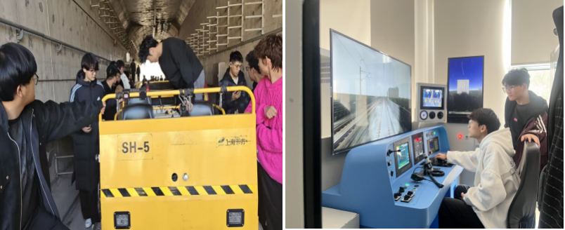 讲座结束后,在基地讲师的带领下,同学们开启了沉浸式实地观摩与实操体验。大家先后走进练兵线、2号仿真列车、模拟调度大厅及模拟站台等核心实训区域,近距离探寻轨道交通工程的设施设备布局与运营管理流程。在模拟驾驶器操作环节,同学们踊跃参与、积极尝试,在基地讲师的专业指导下亲身体验模拟驾驶操作,直观感受轨道交通驾驶的核心技能与规范要求。整个过程中,同学们认真聆听讲解、主动提问交流,将讲座中的理论知识与现场实物、实操体验紧密结合,对土木工程专业的应用场景与职业需求形成了更深刻的认知。