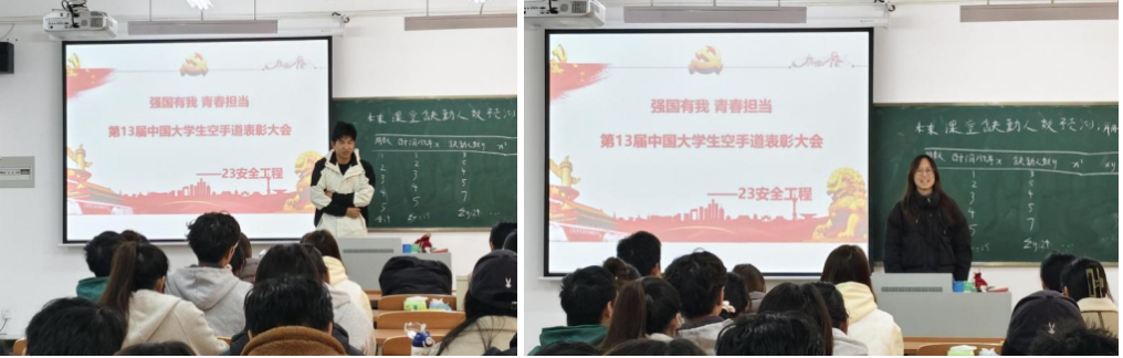 为表彰先进典型、弘扬体育精神,激发全体同学的拼搏热情与集体荣誉感,12月1日上午,土木工程学院2023级安全工程专业于水木楼北404教室召开“强国有我 青春担当”赛事表彰主题班会。班会由辅导员束露露、班主任周成颂共同主持,专业全体学生参加,重点表彰在《第十三届中国大学生空手道锦标赛》中斩获佳绩的李正义、戴子怡两位同学,分享他们的奋斗历程,传递顽强拼搏、全面发展的青春正能量。