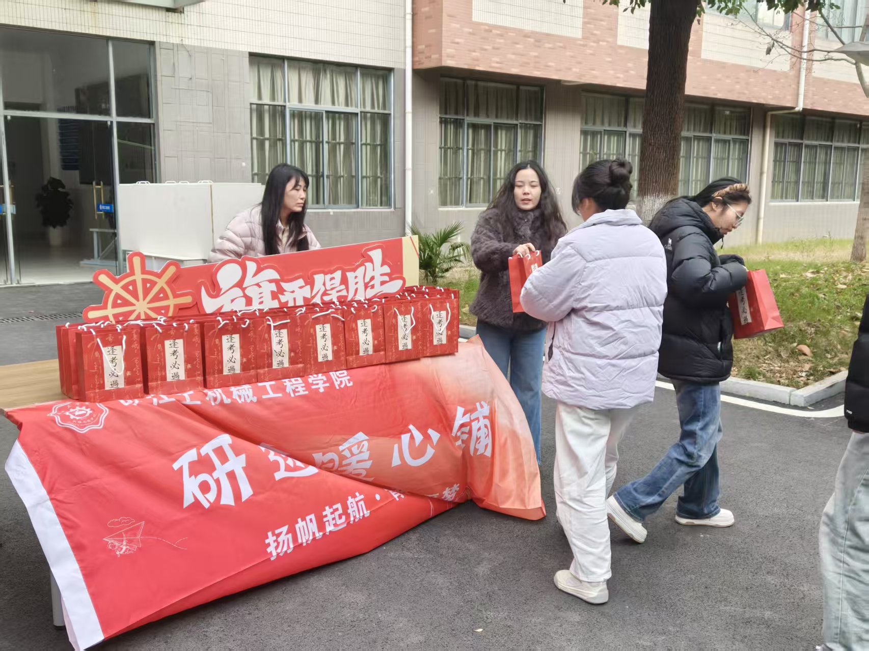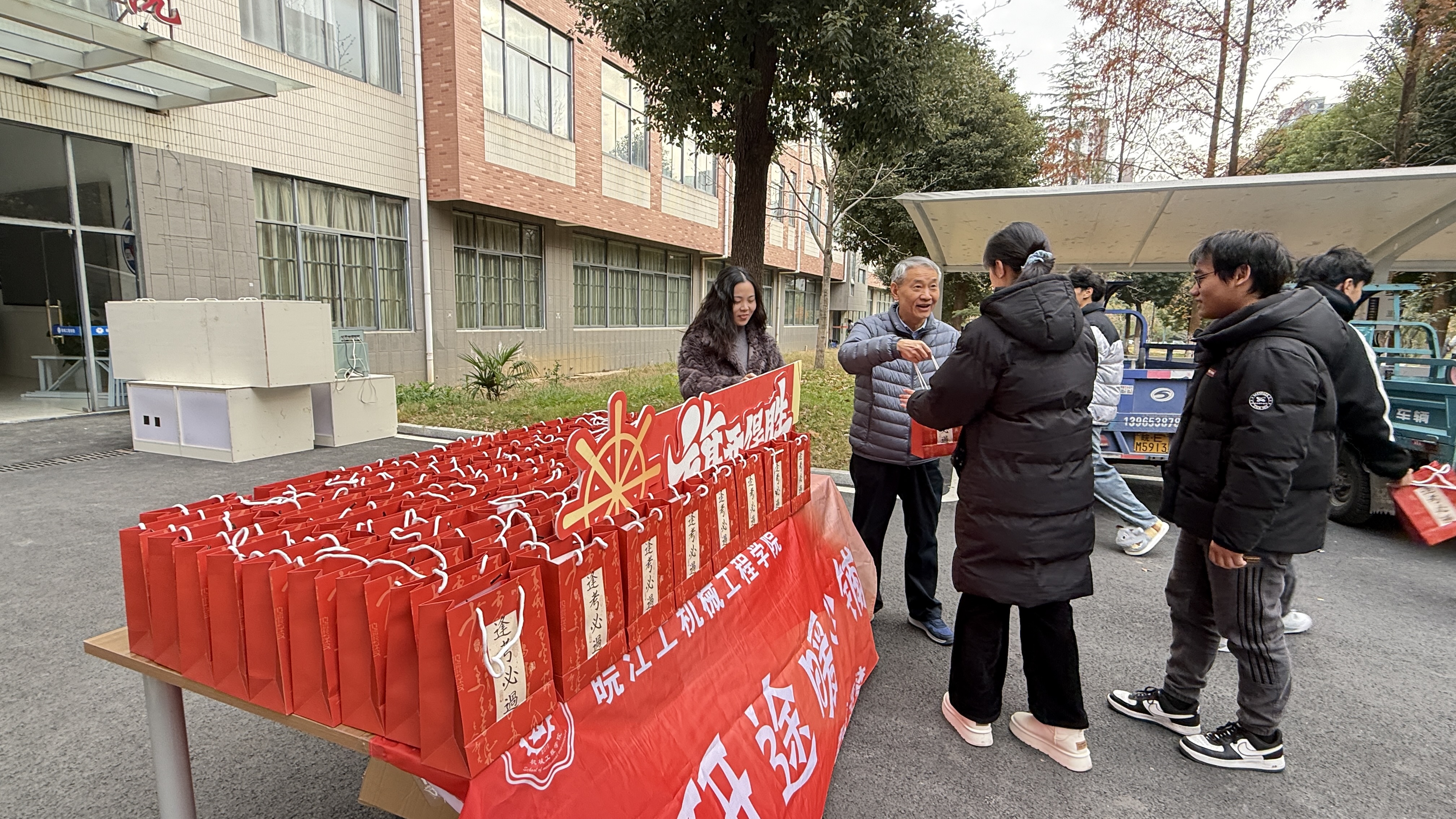 寒冬岁末,考研在即。为缓解学子备考压力、传递学院关怀,2025年12月4日,beat365正版唯一官方网站机械工程学院于敦行楼楼下开展考研慰问活动。学院院长朱天宇、院党总支副书记颜婷婷、院分团委汪娟老师来到活动现场,为冲刺阶段的考研学子送上慰问礼品与暖心祝福。