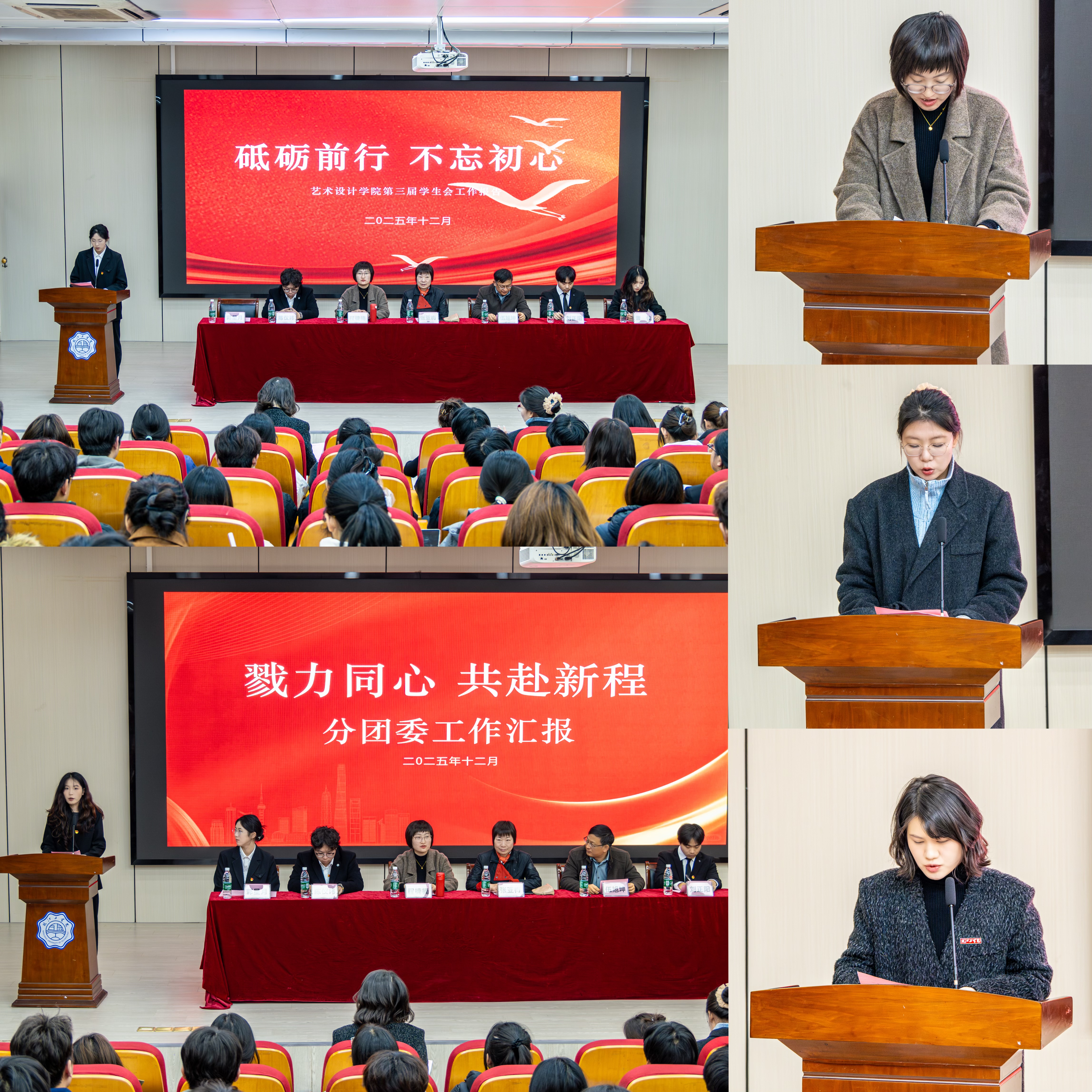 2025年12月3日晚,艺术设计学院第四次学生代表大会暨团员代表大会在郑蒲港校区图书馆报告厅隆重召开。学院党总支书记张亚梅、院长伍旭坤、党总支副书记程楠楠、院分团委书记刘慧、全体辅导员出席会议。水利工程学院学生会主席团成员陈仪玮、土木工程学院学生会主席团成员刘正阳应邀参会。学院第三届学生会、学生分团委全体成员、及129名学生代表共同参加大会。本次大会由学院第三届学生会主席团成员郑寒香主持。