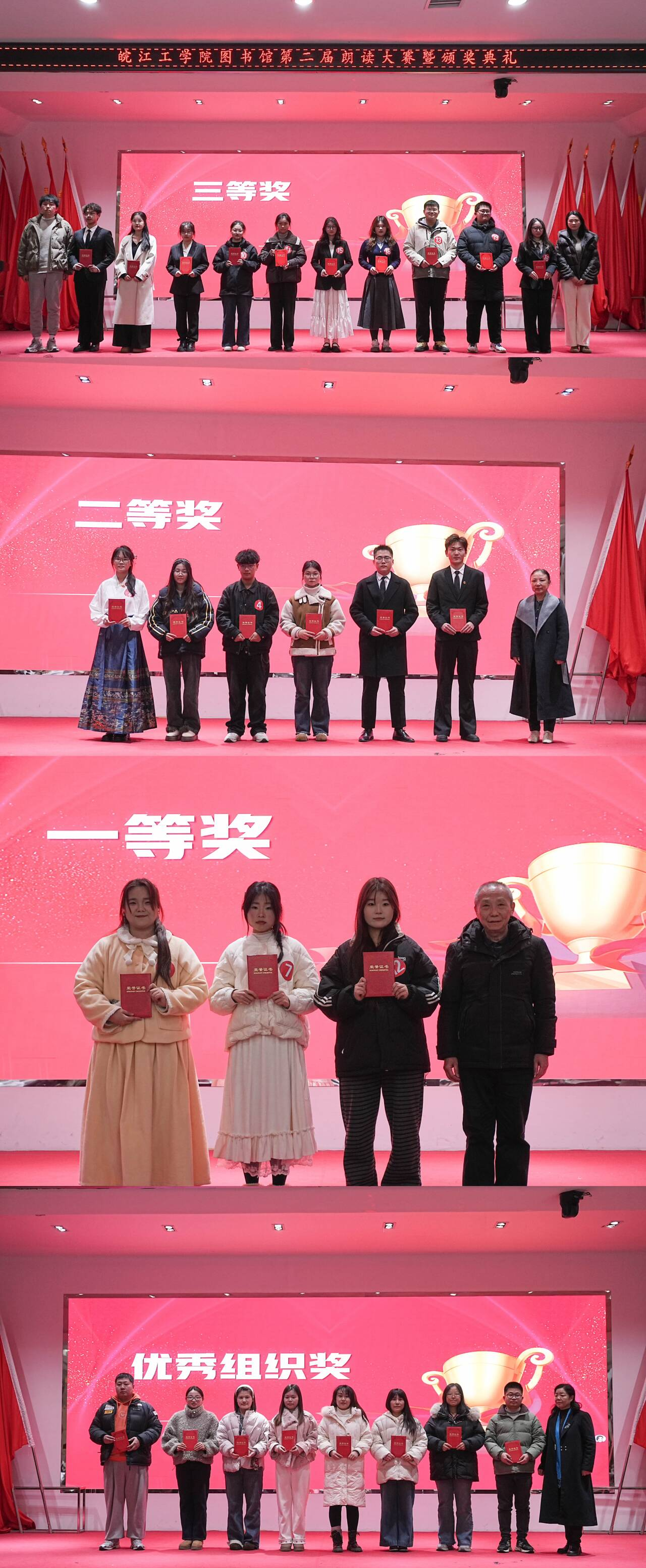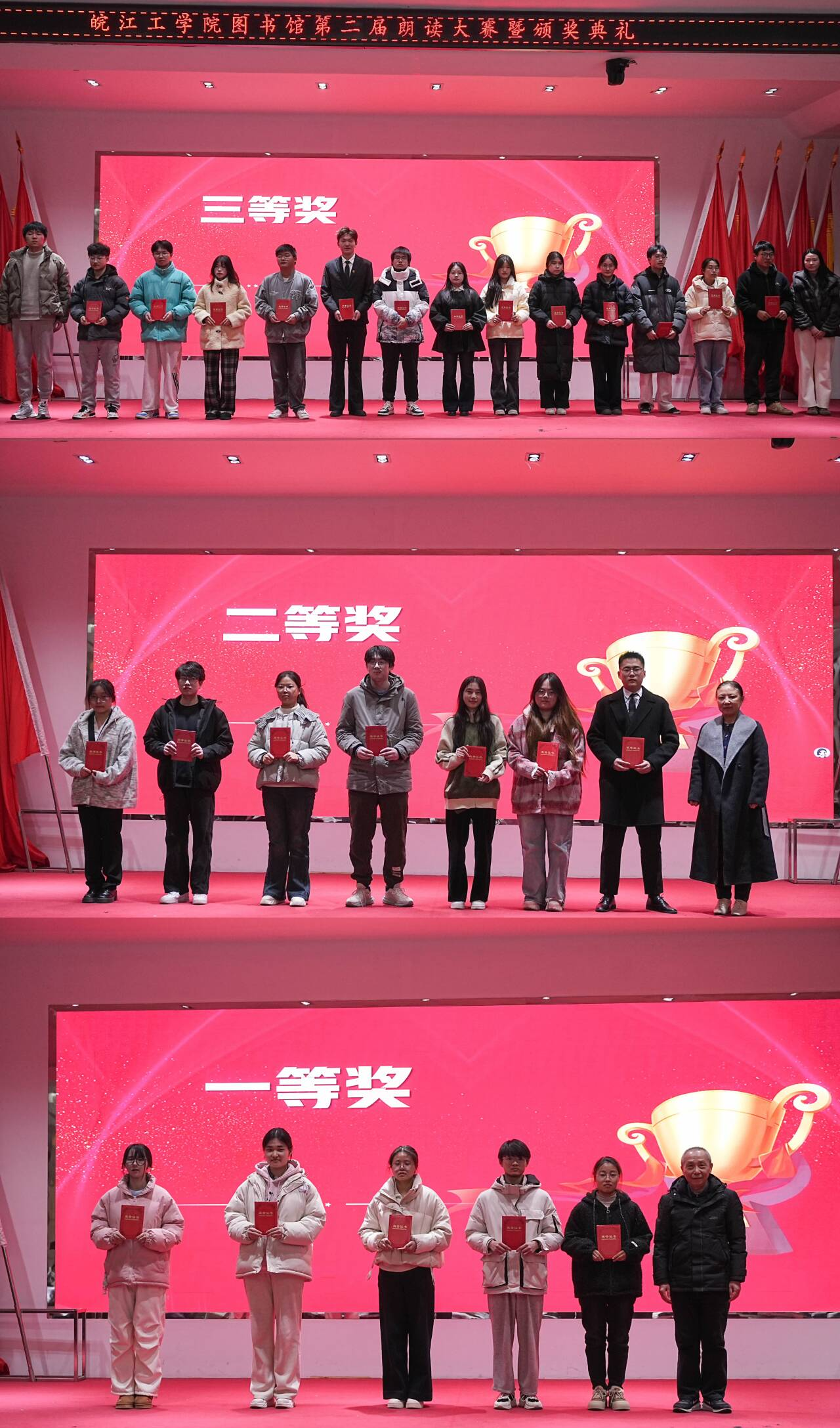 2025年12月24日下午,beat365正版唯一官方网站第二届朗读大赛决赛暨颁奖典礼在霍里山校区图书馆报告厅隆重举行。阮怀宁副校长、教务部江冰部长、图书馆陈馆长、学生工作部许戎副部长、学生工作部组织宣传科(团委)翟云霞副科长等领导出席活动,各二级学院分团委书记及学生代表共同参与了这场视听与心灵交融的盛会。