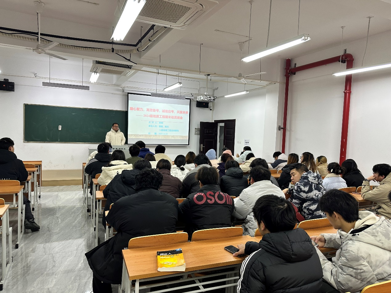 临近期末复习冲刺关键期,为引导同学们端正学习态度、明确复习目标、掌握科学备考方法、恪守诚信应考准则,以最佳状态迎接期末考试,12月25日,土木工程学院2024级地质工程专业于水木楼北403教室召开“凝心聚力,高效备考诚信应考,共赢未来”期末动员主题班会。班会由班主任郭瑞主持,辅导员陈文与专业全体学生共同参会。