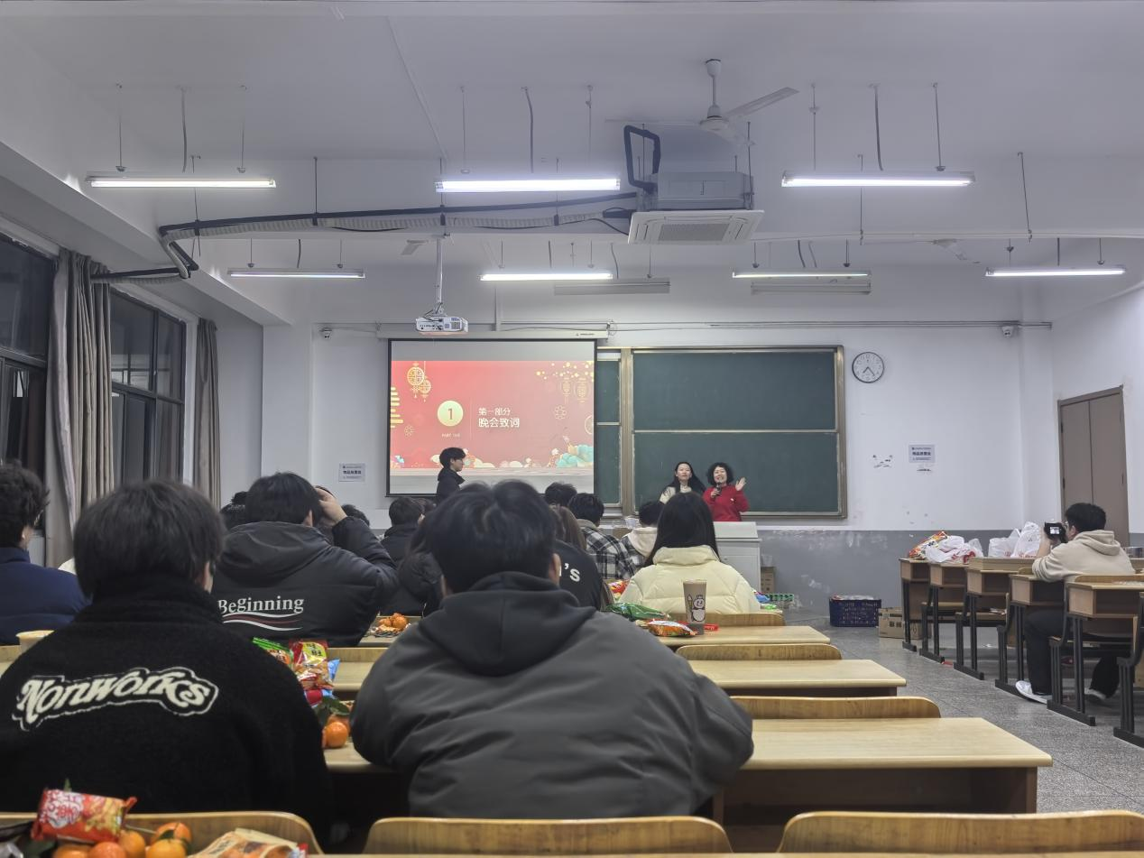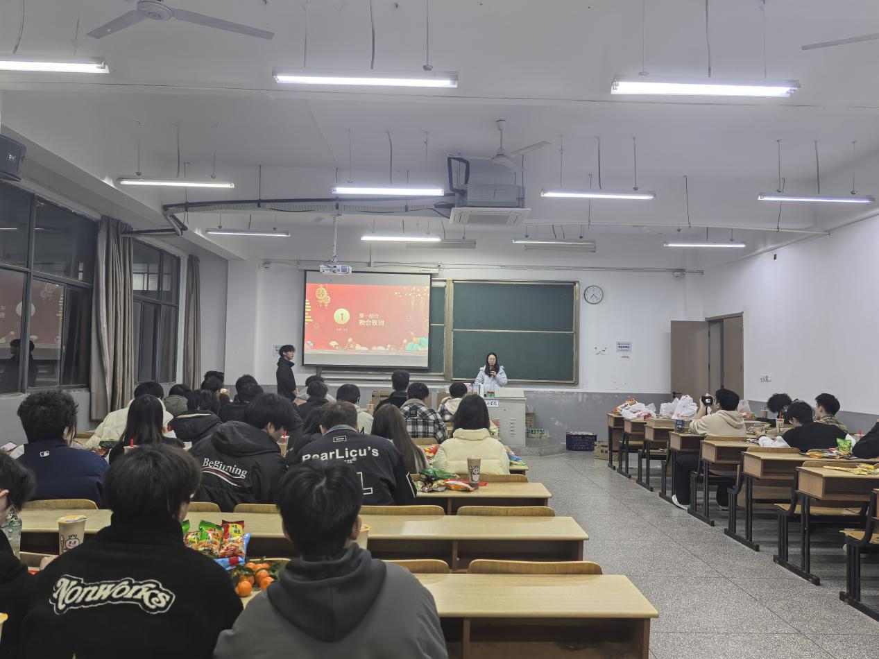 致辞环节温情满满,辅导员姚慈航与班主任李锦景、陈颖钦依次登台。三位老师充分肯定了同学们在过去一年里,在学业探索、班级建设、生活相处等方面取得的成长与进步,言语间满是欣慰与赞许;同时为大家送上饱含殷切期许的新年祝福,勉励全体同学在新的一年里不忘初心、勇敢追梦,以昂扬向上的姿态不负韶华、不负时光,在青春赛道上奋力奔跑、续写精彩篇章。真挚的话语直抵人心,引发全场同学的强烈共鸣,现场掌声经久不息。