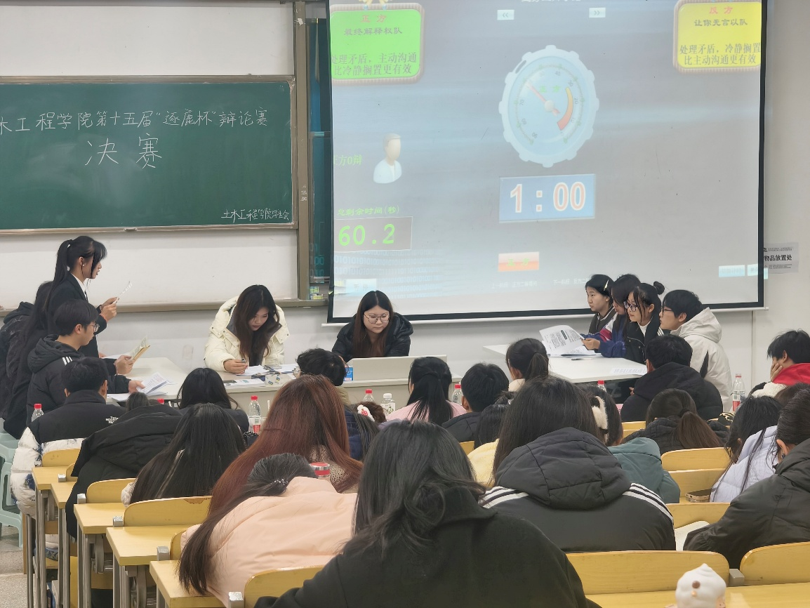 12月28日,土木工程学院“砼心筑梦”系列活动之第十五届“逐鹿杯”辩论赛决赛在郑蒲港校区D102教室圆满开展。该项比赛也是学院“砼心向学,挑战未来”系列活动中的经典赛事之一,自启动以来,便得到全院学子的踊跃响应与积极参与。经过初赛、复赛多轮激烈角逐,“给排水队”与“土木院学习部队”凭借扎实的辩论功底与出色的团队协作,一路过关斩将,最终脱颖而出,站上决赛的舞台。25级辅导员杜可、孙倩到场,与现场学子共同见证这场思维交锋的巅峰对决。