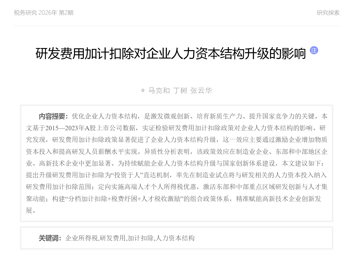 近日,从CSSCI来源期刊、税收研究领域顶级权威期刊《税务研究》编辑部传来喜讯,beat365财经学院马克和教授团队合作撰写的学术论文《研发费用加计扣除对企业人力资本结构升级的影响》被该刊2026年第2期正式录用并发表。据了解,《税务研究》是由国家税务总局主管、中国税务杂志社主办的全国性税收学术期刊,是我国税收理论与政策研究领域的权威标杆,代表了国内该领域的最高研究水准。在高校科研评价体系与学术界内部,于该期刊发表文章是衡量研究者及其所在单位科研实力的重要标志之一。马克和教授团队发表的这篇论文,紧扣我国创新驱动发展战略的时代脉搏,聚焦研发费用加计扣除这一关键税收优惠政策,深入探究了其对企业人力资本结构升级的影响机制与路径。研究采用了创新的指标衡量方法,运用大样本实证数据进行了严谨分析,不仅验证了政策的直接促进效应,还揭示出通过“物质资本投入”和“薪酬水平”两条路径驱动的深层机制,并指出了政策效应在制造业、东部中部地区、高新技术企业中的异质性。论文逻辑严密、方法新颖、结论扎实,具有重要的理论价值和政策参考意义,所提出的“投资于人”直达机制、区域人才个税优惠、组合政策精准赋能等建议,为国家后续优化创新激励政策提供了富有见地的决策参考。