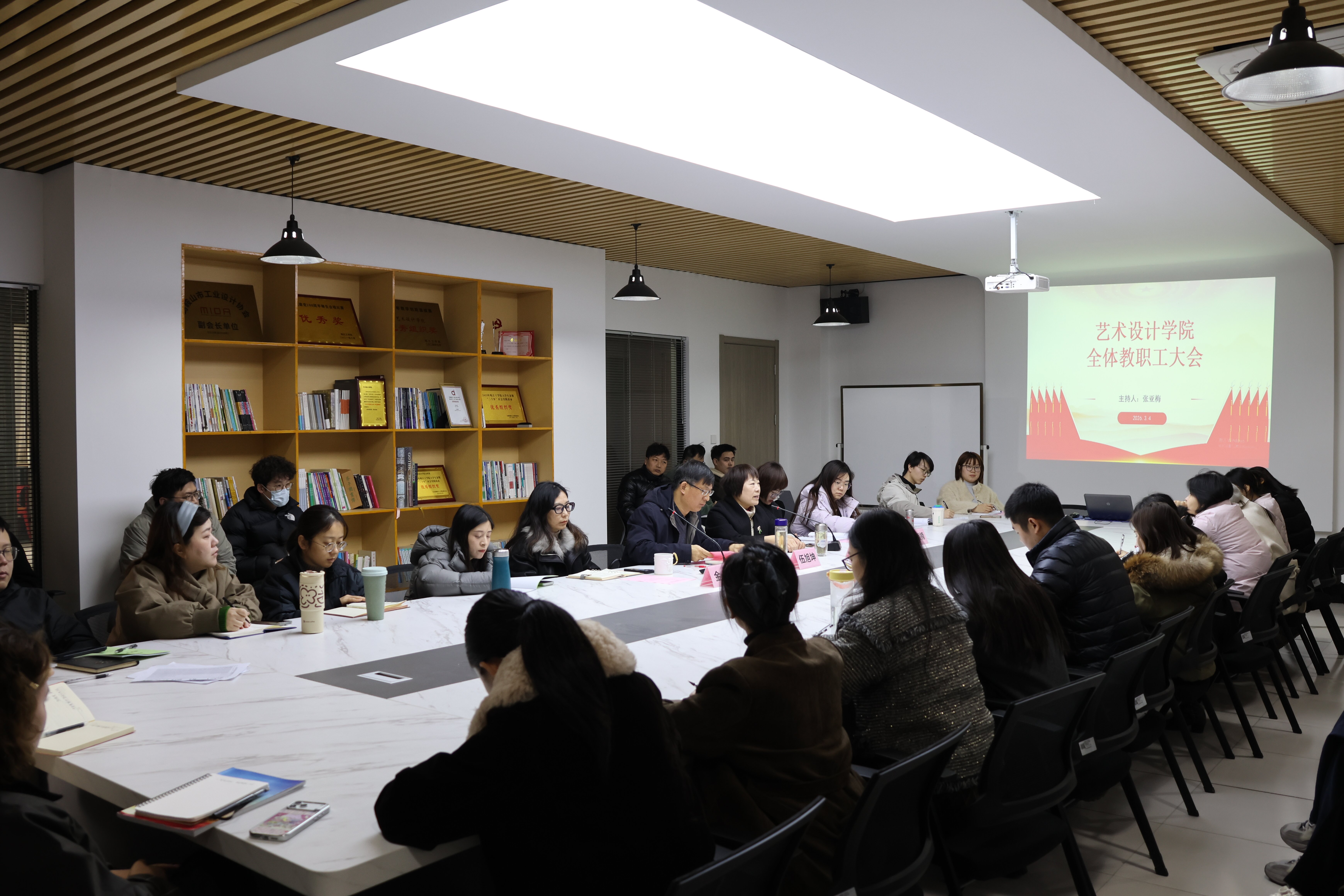 为全面部署新学期各项工作,明确奋斗目标,凝聚全院奋进力量,3月4日下午,艺术设计学院在洪雅楼203会议室召开新学期全体教职工大会。会议由学院党总支书记张亚梅主持,学院领导班子及全体教职工参加会议。