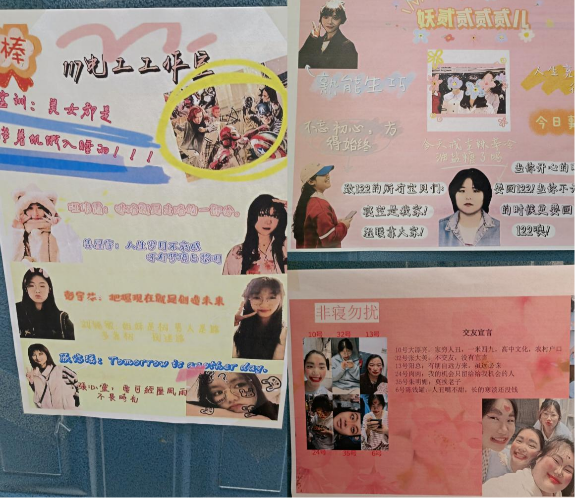 创建学生宿舍文化品牌既是一次同学情、宿舍爱的涌动,更是一次创造力、创新力的比拼。为展现自己宿舍特有的风格和特色,同学们在保证宿舍卫生和宿舍安全的前提下,积极发挥想象力和创造力,以海报、板报、文化小天地等精彩丰呈的形式,谱写宿舍“家训”、描绘卡通人物简画、张贴“全家福”...一张张笑脸仿佛星星般闪烁,仿佛正印证了那句“友谊面前,我们和星星一样,不是彼此妨碍,而是互相照耀”。