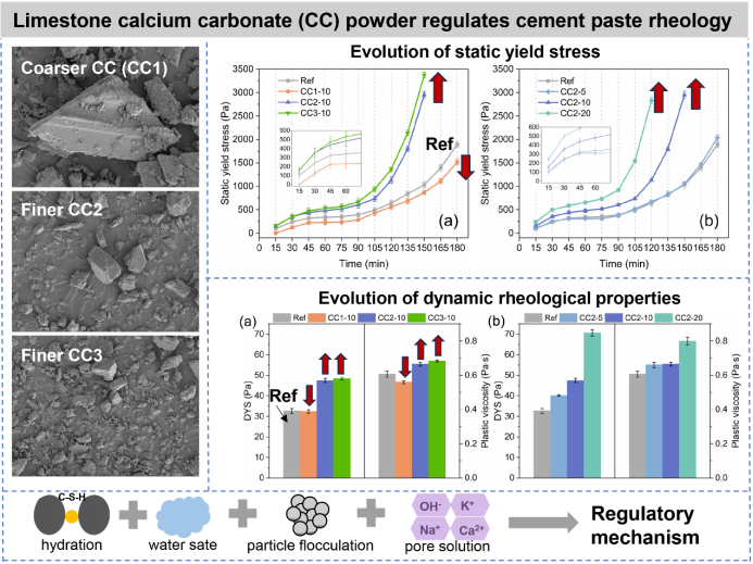 石灰石粉是采石作业和研磨过程中产生的一种副产品,其粉尘形态易诱发空气污染。石灰石粉可作为水泥的替代品从而降低水泥中熟料的占比。使用石灰石粉不仅可以消纳石灰石粉减轻环境负担,还能减少水泥熟料用量降低混凝土碳排放。该研究从物理和化学效应的角度厘清了石灰石粉的粒径和掺量对水泥浆体早期结构形成的影响和调节机制,对更好地控制泵送混凝土的泵送性以及3D打印混凝土的可打印性具有重要意义。