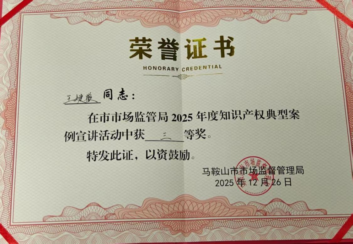 校创新工程实践团队聚焦知识产权教育与成果转化,近日团队成员王婕薇老师在马鞍山市市场监督局2025年度知识产权典型案例宣讲活动中荣获三等奖,彰显团队在学生创新能力培养与知识产权保护领域的核心成效。