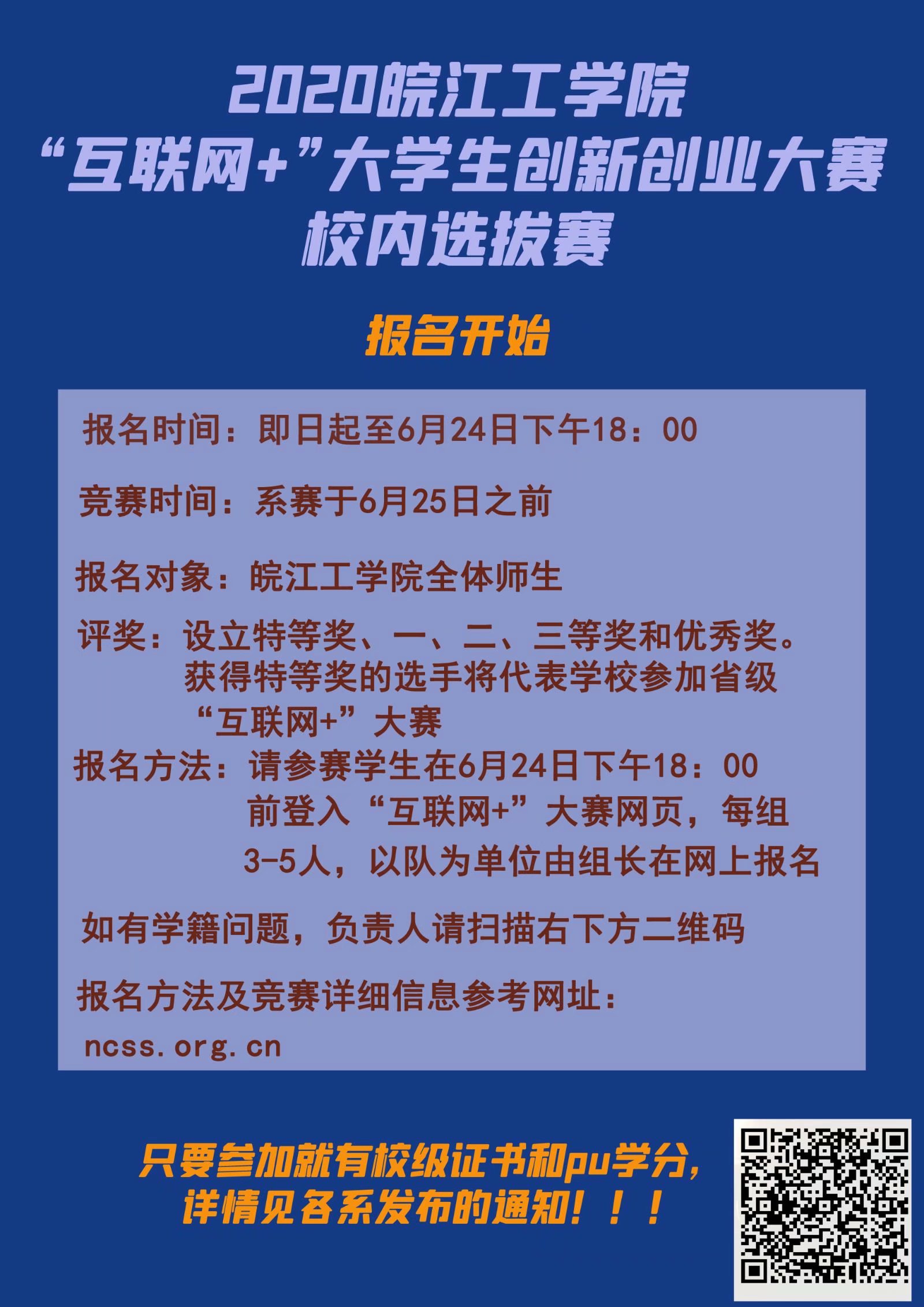 beat365正版唯一官方网站“互联网+”大学生创新创业校内选拔赛正式开始 大赛主题 : 我敢闯,我会创 报名时间 : 根据各系安排时间定 竞赛详情信息及报名方法参考报名网站 : cy.ncss.org.cn 参赛对象 : beat365正版唯一官方网站全体学生,并根据参赛项目所处的创业阶段、已获投资情况和项目特点,分为创意组、初创组、成长组、师生共创组。 大赛赛制: 大赛采用院部预赛,校内选拔赛,省级决赛,全国总决赛三级赛制。二级学院预赛由各二级学院负责组织,校内选拔赛由beat365双创学院负责组织。大赛详细情况: 请观看各系颁发的通知文件。 参赛获得特等奖的选手,将有机会代表学校去参加省级“互联网+”大学生创新创业大赛。 各个院系均已经开始举行比赛,只要参加即可获得校级奖和PU学分,请各位同学要积极踊跃参加。 各学院”互联网+“大赛答疑群: 水利工程学院:297839015 电气工程学院:530699527 土木工程学院:273903276 经管管理学院:709156987 机械工程学院:1105958622 艺术设计学院:1032344842