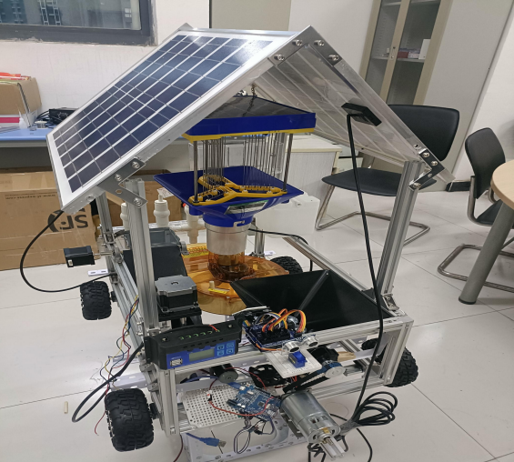 上图是团队的部分创新项目实物图,它是基于北斗导航自动循迹的远程控制下,可以精准高效的杀害虫,防止拆卸困难等问题。团队不仅帮助大学生解决了许多创新创业过程中的难题,还为他们提供了一个良好的创业环境和平台,帮助他们更好地发展和壮大自己的创新创业项目。