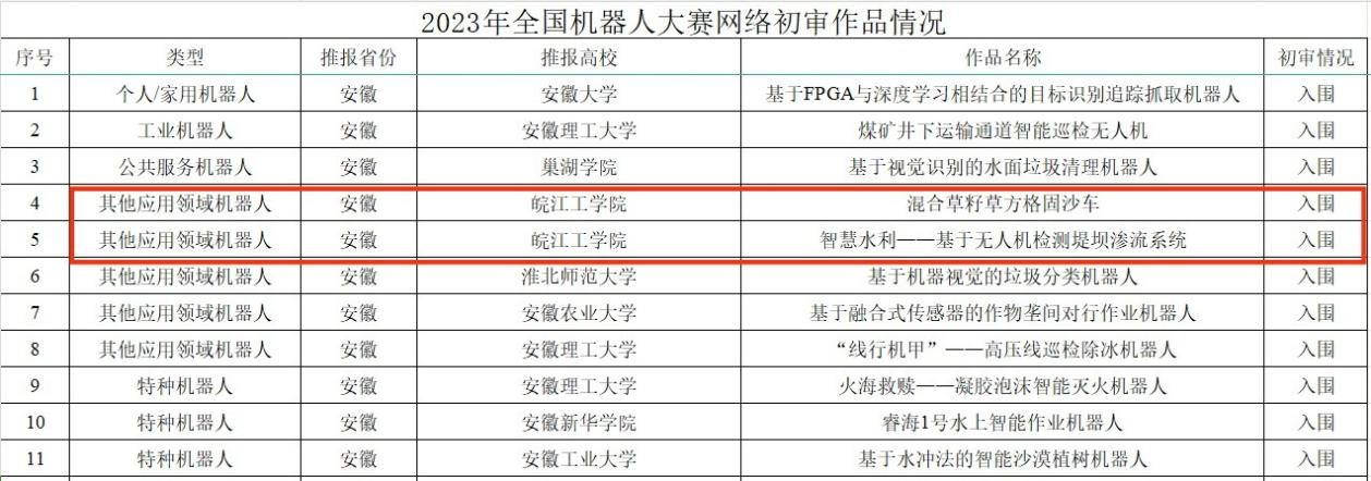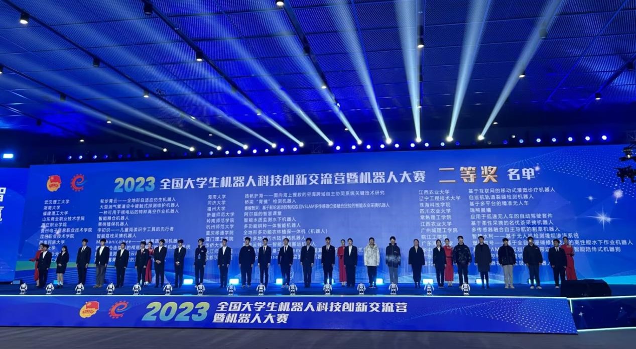 2023年12月17日至19日,由共青团中央、工业和信息化部主办的2023年全国机器人大赛科技创新交流营暨机器人大赛在山东省日照市举办,本次大赛共吸引来自全国30个省、自治区、直辖市及新疆生产建设兵团431所高校的1017件作品参赛。历经省级遴选上报、全国组委会审核,此次大赛共计218件作品入围全国总决赛,安徽省11件,beat365《混合草籽草方格固沙车》和《智慧水利— —基于无人机检测堤坝渗流系统》两件作品入围全国终审答辩。经现场激烈角逐,《混合草籽草方格固沙车》荣获国家一等奖,《智慧水利——基于无人机检测堤坝渗流系统》荣获国家二等奖。