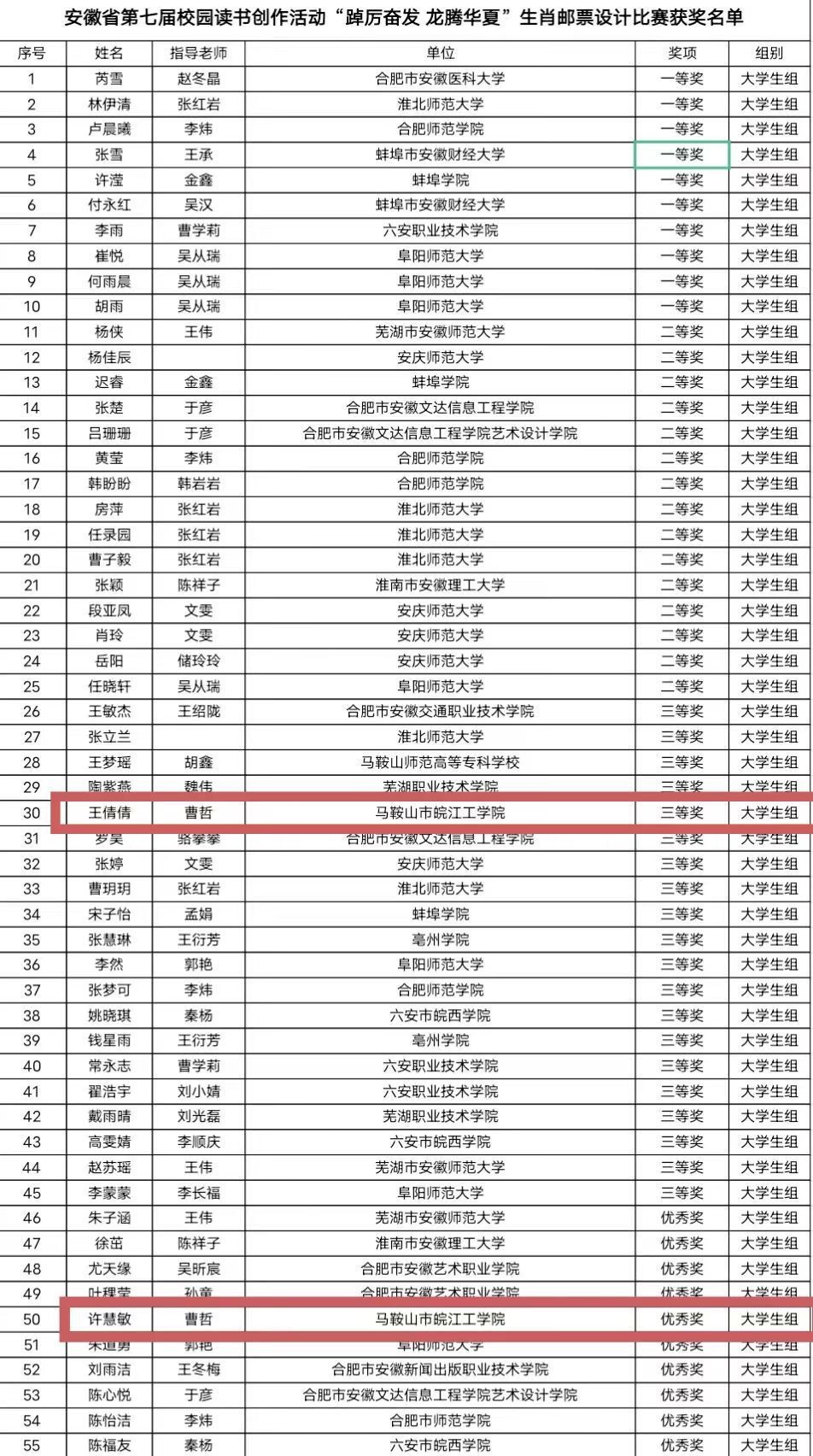安徽省校园读书创作活动由省委教育工委、省教育厅、省人社厅、省文旅厅、省新闻出版局、团省委共同举办,是“书香安徽”全民阅读活动重点活动之一,已连续举办7届。活动以“读书引领人生,创作点亮梦想”为宗旨,广泛开展主题征文、书画比赛、生肖邮票设计大赛等丰富多彩的各类阅读活动,取得了广泛的社会关注和良好的育人效果。beat365根据《关于印发安徽省第七届校园读书创作活动方案的通知》要求,积极组织开展校内选拔赛。校团委通过科学组织、多维宣传、有效跟进、规范评审、精心修改,择优报送作品至省组委会。经省组委会认真严格的评选,22级环境设计专业王倩倩同学和许慧敏同学以优异成绩荣获本届生肖邮票设计大赛省三等奖和优秀奖。