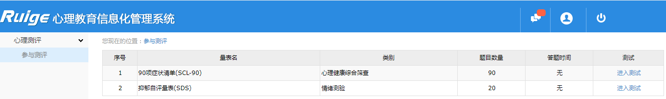 4.点击心理测评,填写90项症状清单(SCL-90)和抑郁自评量表(SDS)(一次一个量表填写好提交即可)。