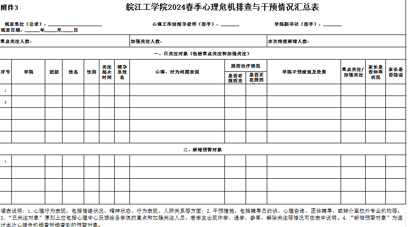 各学院开展排查工作时需结合心理中心反馈的重点关注和加强关注人员名单,访谈人员要认真填报《心理问题关注对象访谈记录表》(见附件2),心理工作站填报《心理危机排查与干预情况汇总表》(见附件3),建立健全心理档案。3月22日前将两表的纸质版以密封件形式交至心理中心(F105西),附件3电子版发送至1679734226@qq.com邮箱,并同时报本学院主管学生工作领导备案。