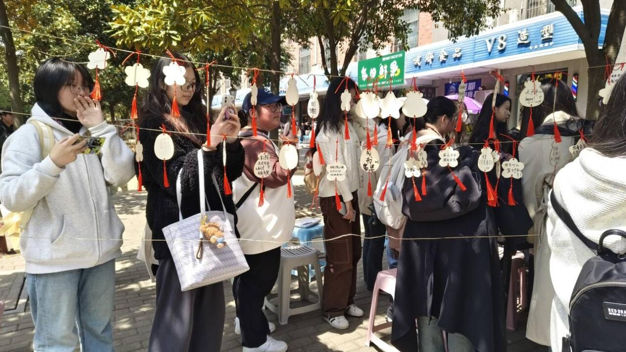 为营造温暖的校园氛围,帮助学生释放压力、传递正能量,大学生心理委员会于2025年4月2日在霍里山校区五食堂门口组织了“心木摇曳,朴树传情”主题活动。通过挂木制卡牌和抽签的形式,鼓励学生表达情感、分享感悟,传递积极的生活态度。