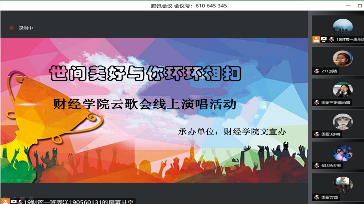 5月5日,财经学院以“世间美好与你环环相扣”为主题举办了心理健康月“云歌会”活动。此次云歌会共有19组同学进行参加,以情景演唱和合唱等形式为主,同时伴有趣味心理健康知识问答环节。云歌会从视觉、听觉等多方面呈现出立体多元的艺术效果。学子们用饱满的热情和精彩的演出呈现出了皖工人阳光乐观的心态,传播了积极向上的正能量!